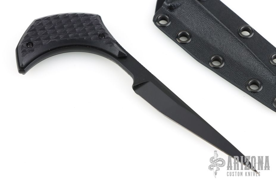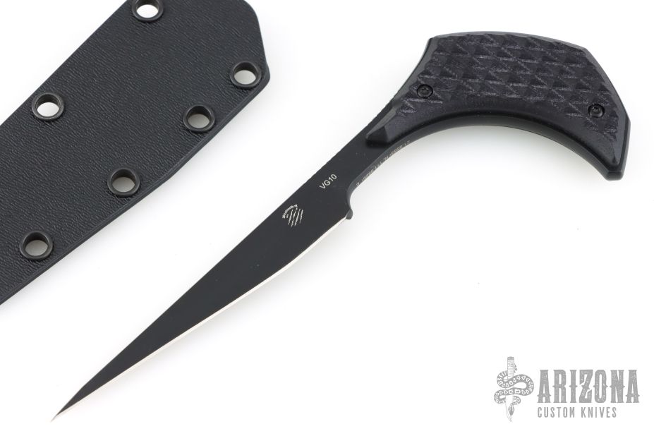 This Gambler by Bastinelli Creations features a black blade with a full tang construction and notched thumbrest.  .185" Blade Stock.  0.572" Blade Depth.  The handle has black G-10 scales.  Includes a black kydex sheath with a padded zippered case.  Has a couple light scuffs, excellent condition otherwise.