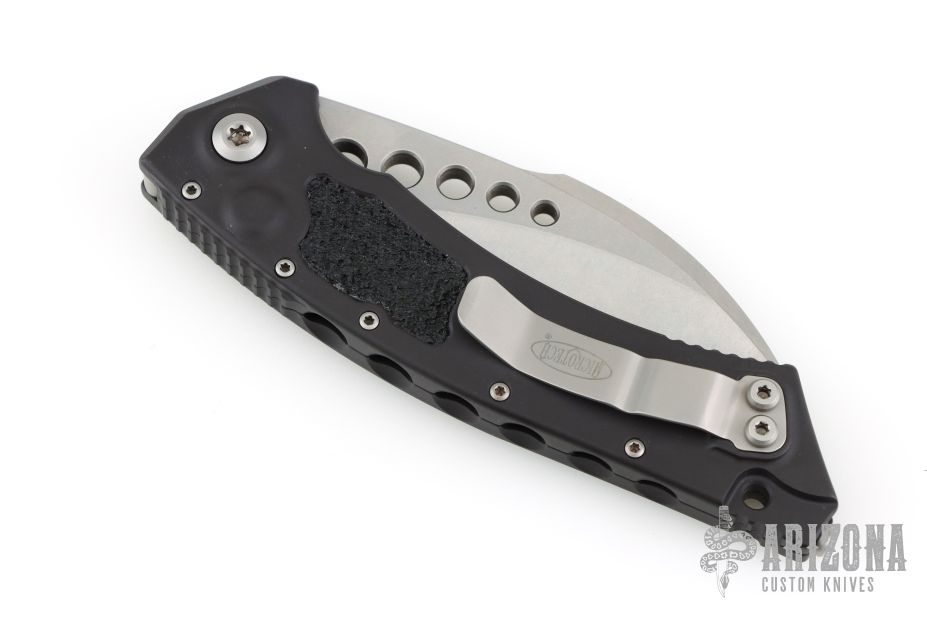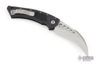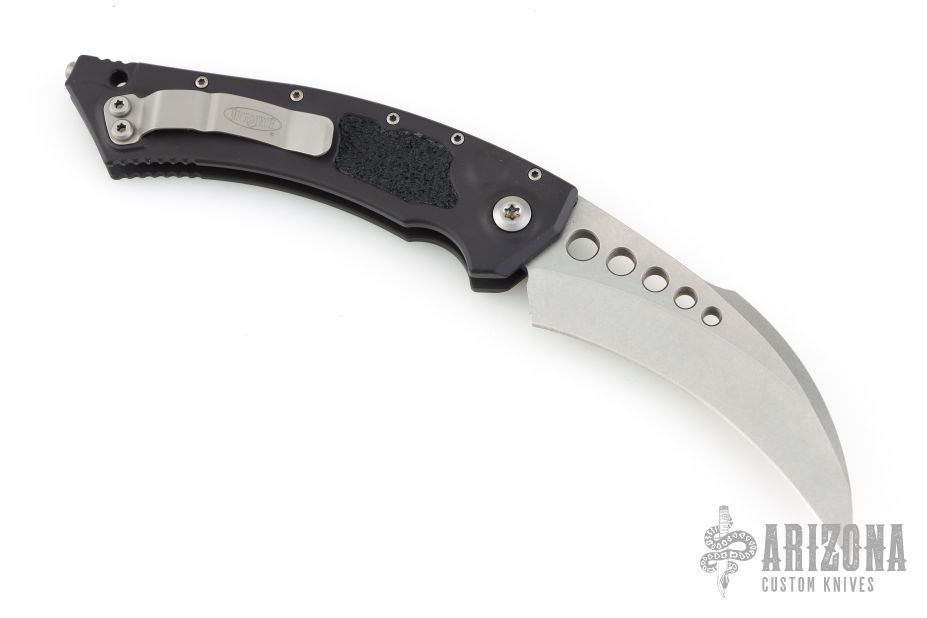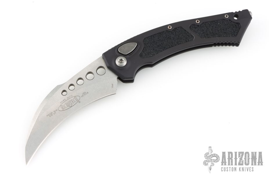 This Hawk Auto by Microtech Knives features a stonewashed hawkbill blade. The handle has a black aluminum frame with blasted stainless steel hardware and tip up clip. Dated 08/2019 and s/n 211 Proof Run. Has a couple light scuffs, excellent condition.