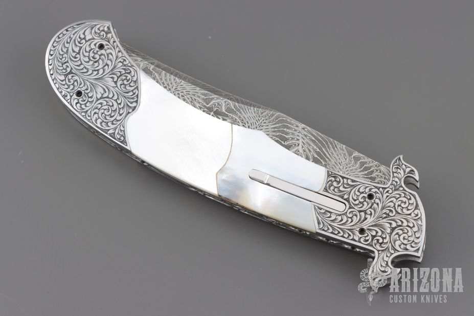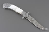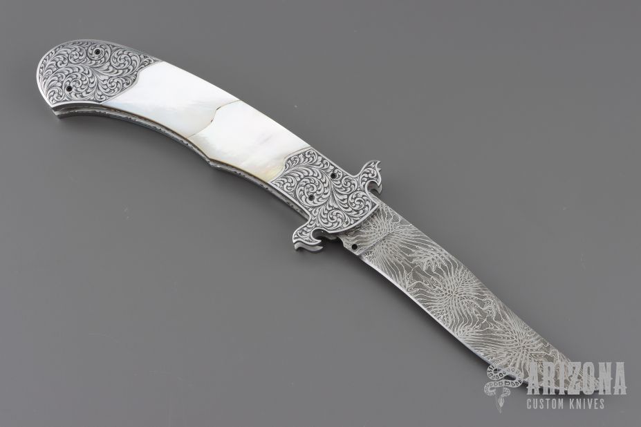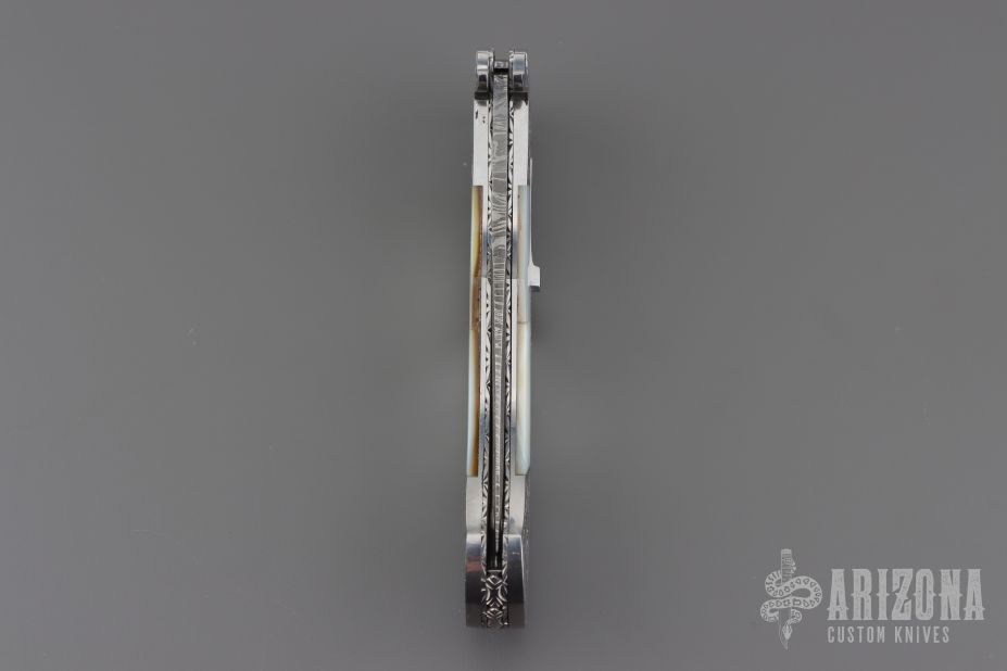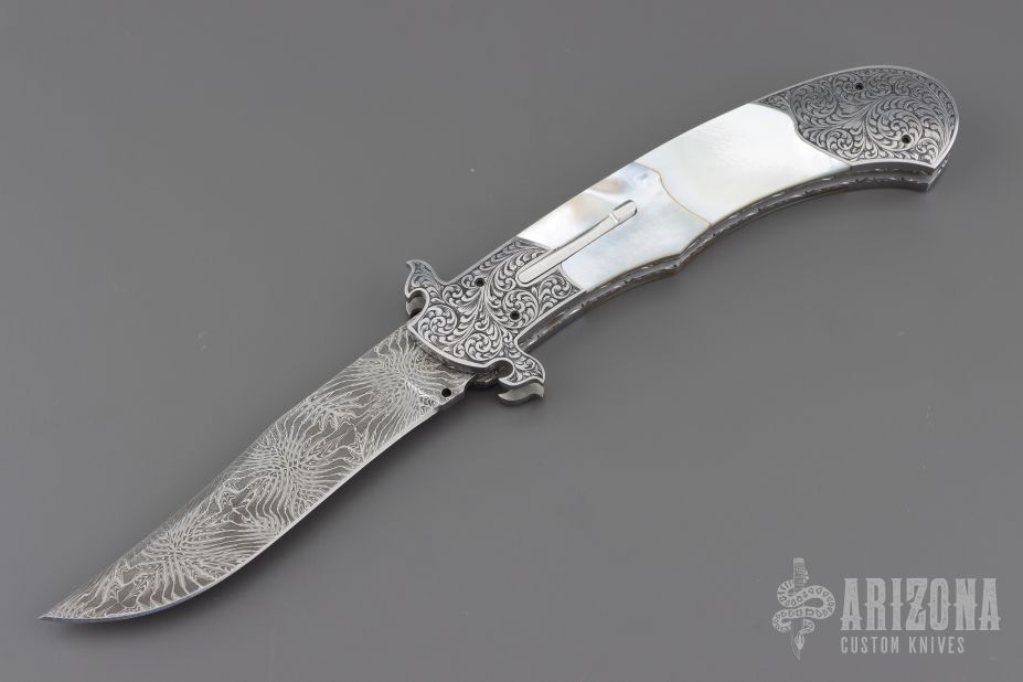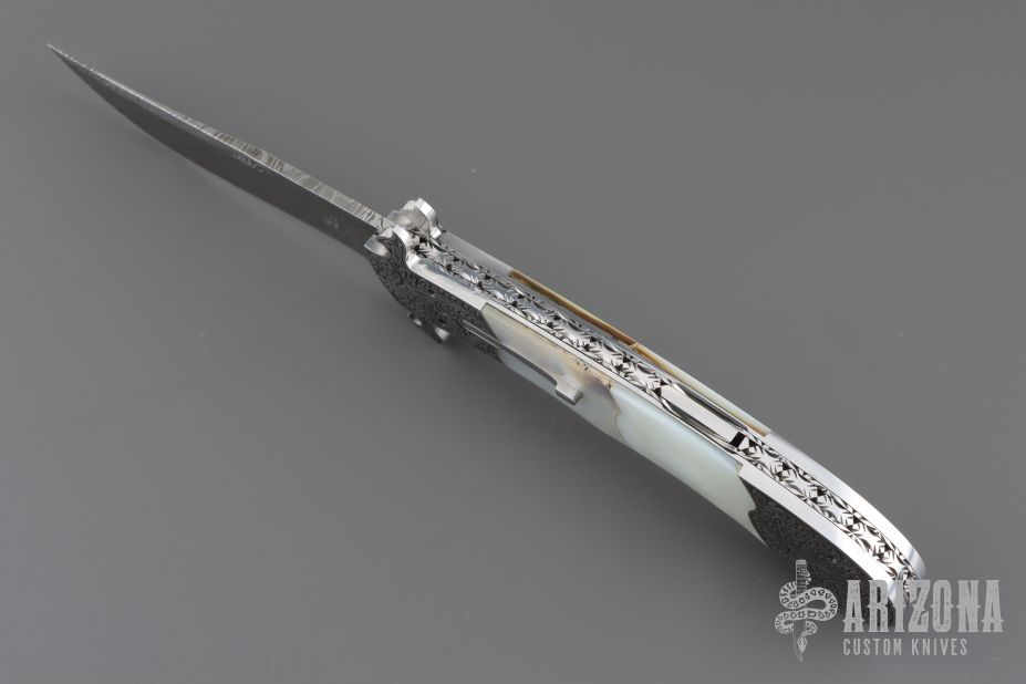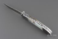 This Lockback Automatic features a Mosaic Damascus blade with false top edge. The handle has engraved stainless steel bolsters, front and rear, multi-piece mother of pearl scales, polished stainless steel rocker bar, fileworked stainless steel liners and backspacer. Nice action, lockup and blade seating. Comes with a zippered case and COA. New from maker.
