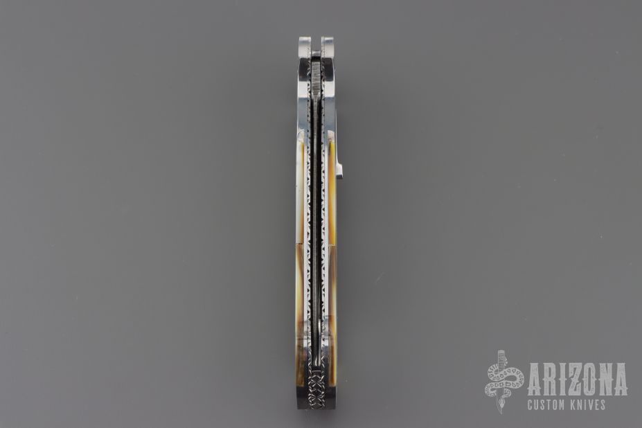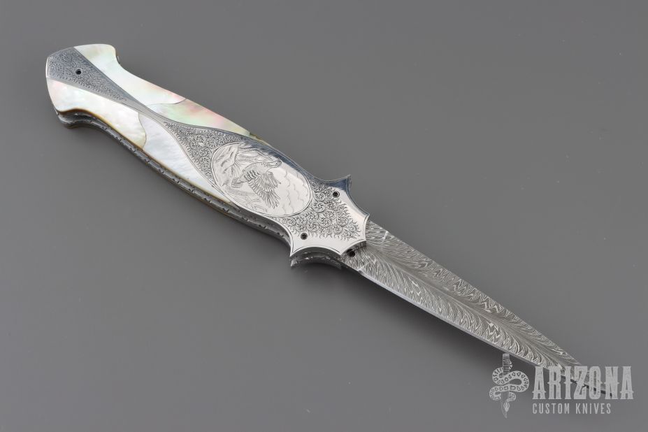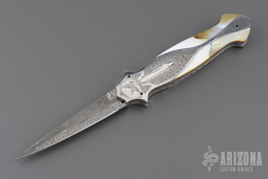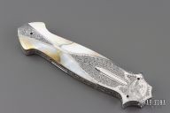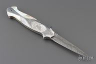 This Lockback Automatic features a Feather Damascus blade with false top edge. The handle has engraved stainless steel scales with multi-piece mother of pearl and black lip pearl inlays, polished stainless steel rocker bar, fileworked stainless steel liners and backspacer. Nice action and lockup. Comes with a zippered case and COA. New from maker.