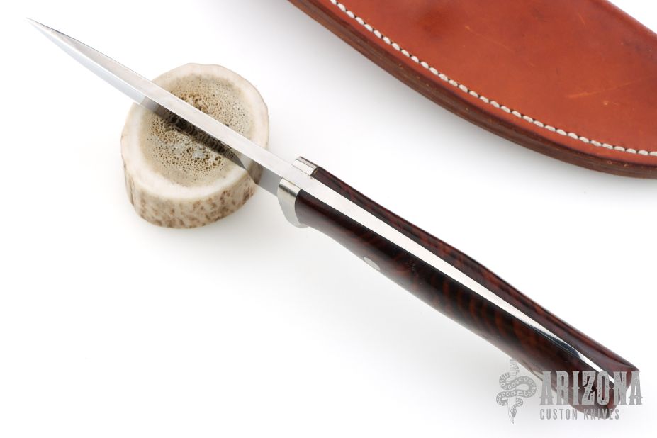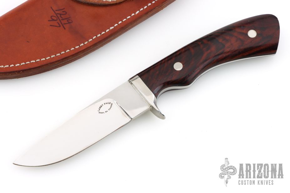This Hunter from Larry Page features a mirror polished drop point blade, .185" blade stock and 1.028" blade depth, full tapered tang. The handle has a polished nickel silver guard, cocobolo scales over black liners. Marked #1219 on the underside of the tang and on the back of the sheath. Comes with a brown leather belt sheath. Has a couple light scuffs and patina. The scales have shrunk slightly, otherwise Excellent condition.