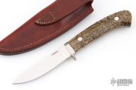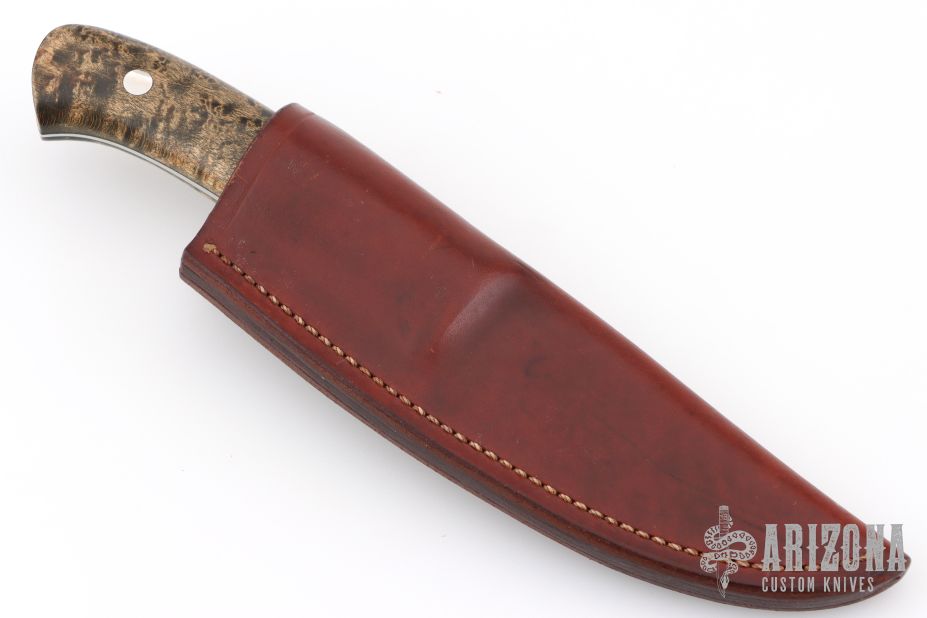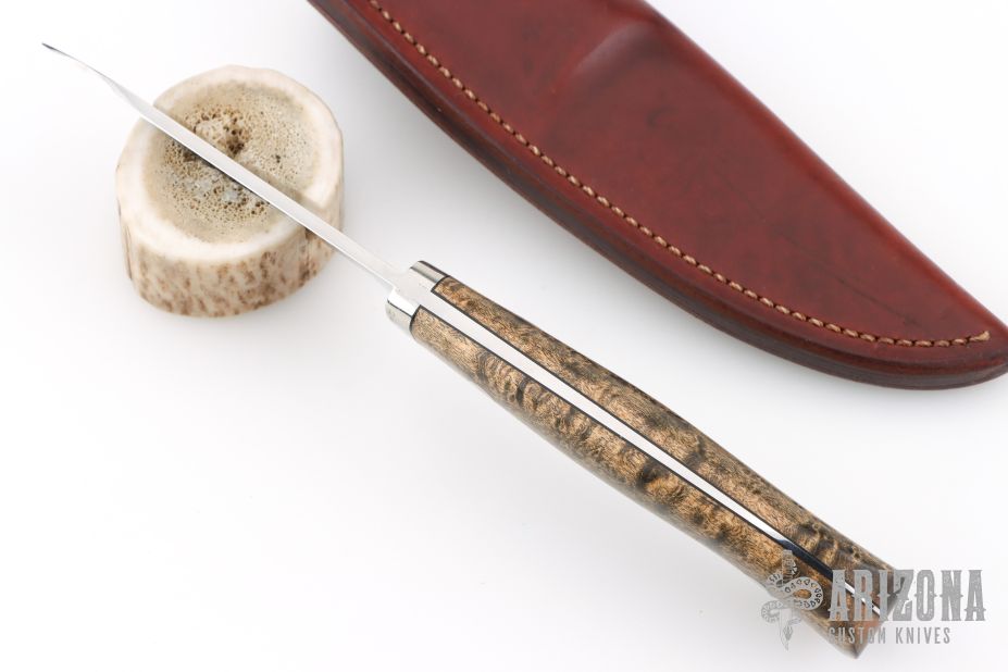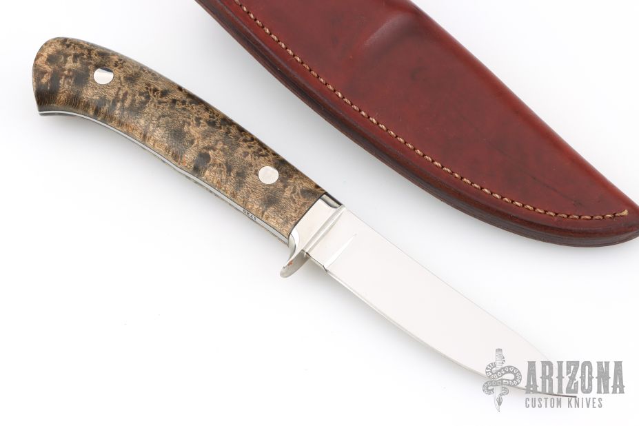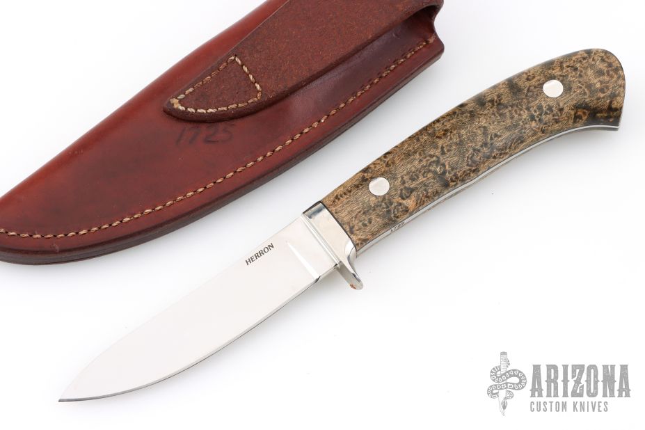 This fixed blade knife from George Herron features a mirror polished guard and blade. .120" Blade Stock .794" Blade Depth. A tapered tang construction with Maple wood scales. Nice lightweight hunter. Very comfortable.  The sheath and knife is marked 1725. Includes a brown leather sheath. Has a couple light scratches, otherwise Excellent Condition.