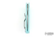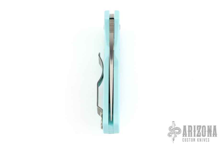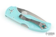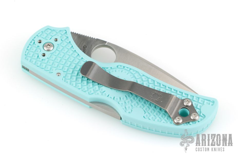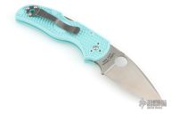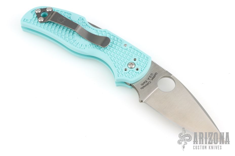 This Native 5 by Spyderco has a plain edged satin finished blade and teal FRN handle with a stainless clip. Comes with original box and papers. New condition.