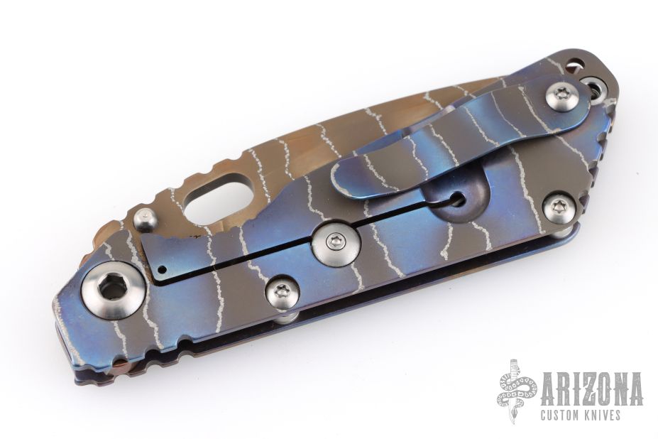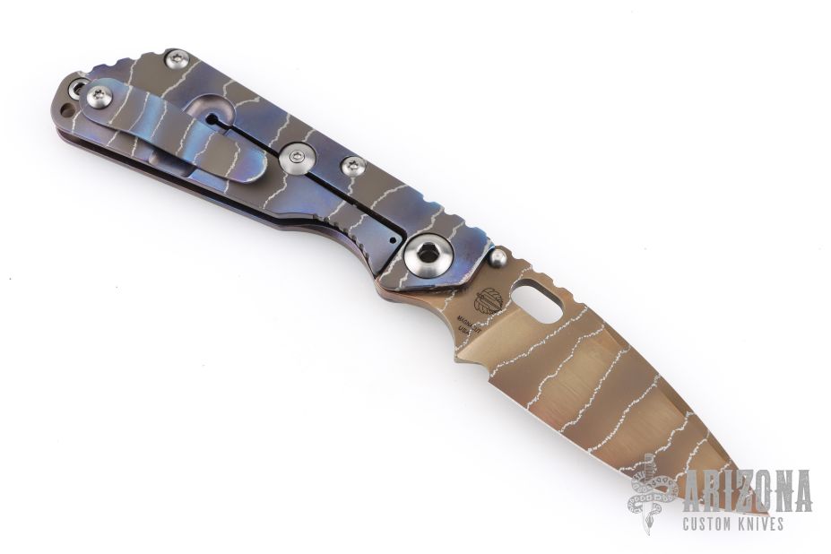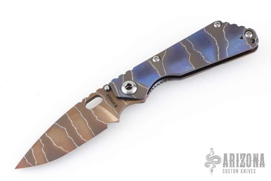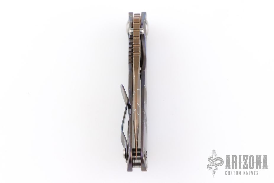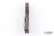 This Mick Strider Performance series SNG framelock folder features a bronze tiger stipe finished drop point blade with thumbhole and notched thumbrest. The handle has a stonewashed and tiger stripe anodized titanium frame with titanium clip, tip up carry. Jimping on blade spine. Includes Hinderer "Lock Bar Stabilizer" for maximum reverse lock retention. Nice lockup, detent, and blade seating. From maker at the 2026 CCKS.