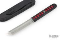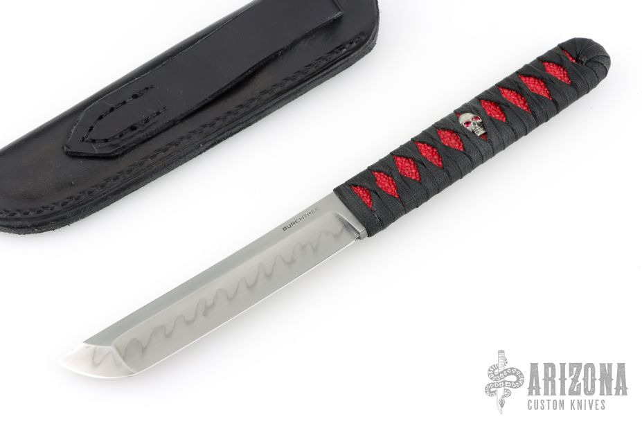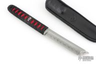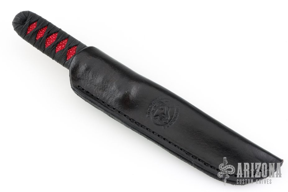 This tanto by Michael Burch features a hand rub satin finished blade with nice hamon, .205" blade stock and .988" blade depth. The handle has black cord wrap over red stingray skin. Comes with a black leather sheath and a zippered case. Comes with COA dated 2/25/09. Excellent condition.