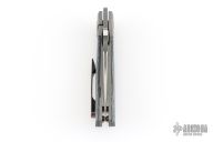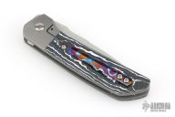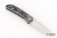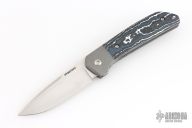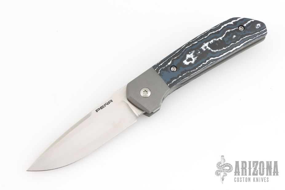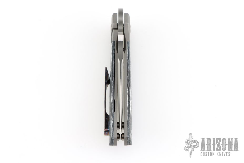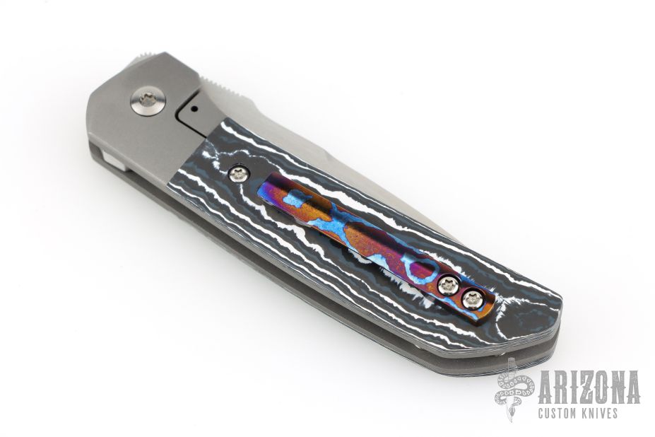 This Mula Front Flipper by Enrique Pena features a hand rub satin finished drop point blade with swedge, notched thumbrest and front flipper. The handle has a blasted titanium frame with black/white CarboTi scales, and a tip up mokuti clip. Nice detent, lockup and blade seating. Comes with zippered case. New from maker.