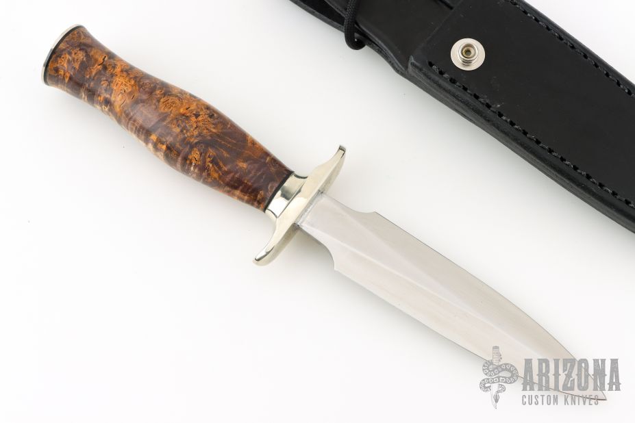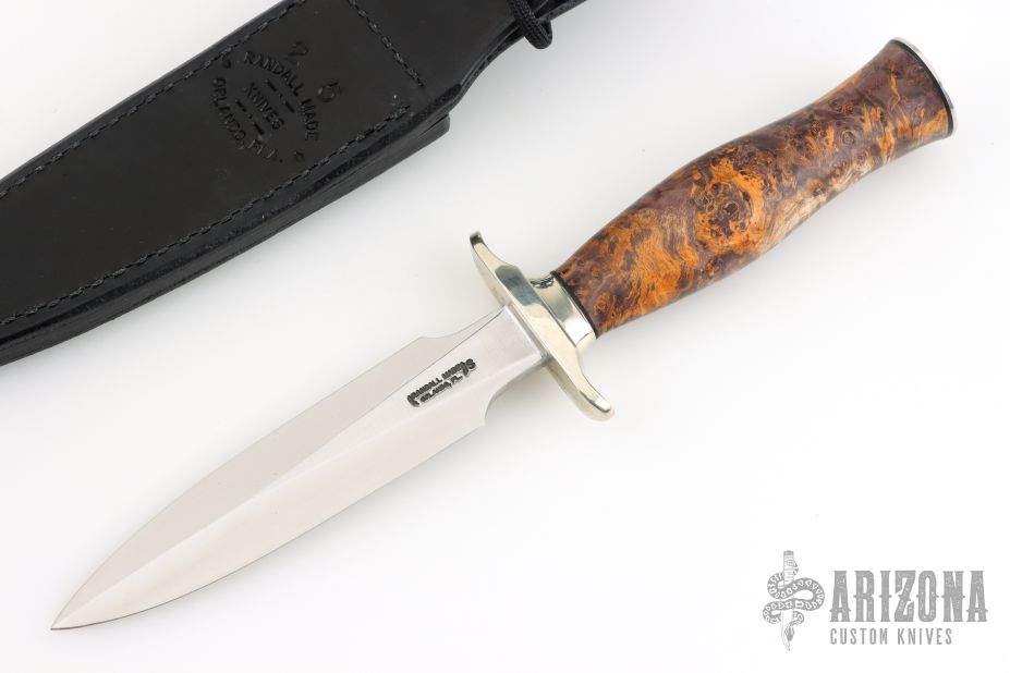 This Model 2-5 Boot Dagger by Randall Made Knives features a double-edged satin finished blade with .189" blade stock and 1.075" blade depth, hidden tang construction. The handle has a nickel silver guard and butt plate, black spacers and a Madrone Burl wood grip. Comes with a black leather sheath. New from maker!