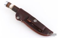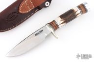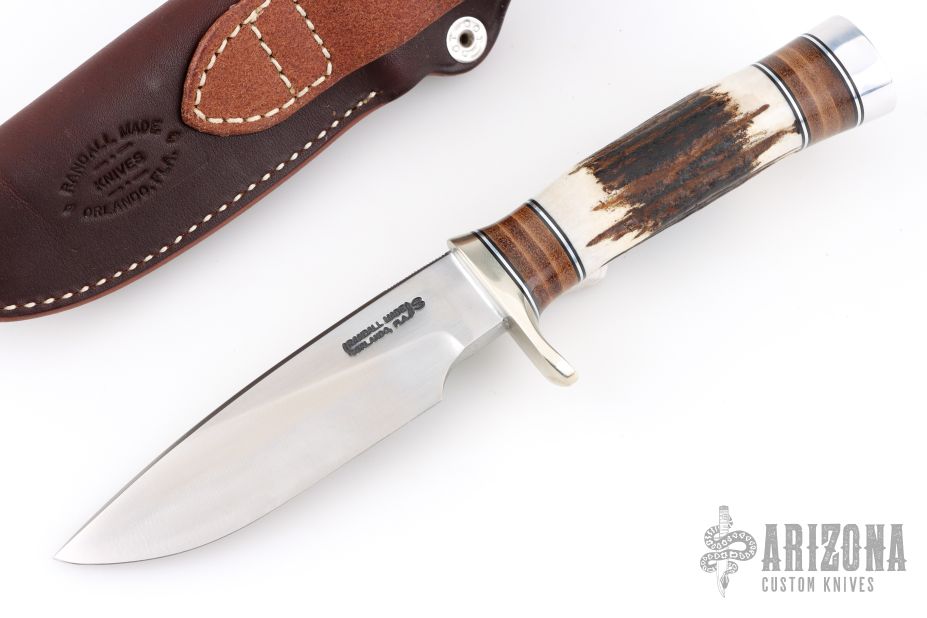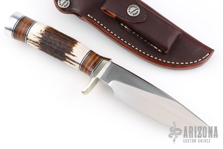 The Model 25-5 by Randall Made Knives is a drop point hunter similar to Model 11, but handle construction is reminiscent of 1930′s design. Excellent skinning, outdoors knife. This knife has a stainless steel blade with notched thumbrest, .236" blade stock and 1.338" blade depth, hidden tang construction. The handle nickel guard and duralumin pommel, stag grip with stacked leather, black and duralumin spacers. Comes with brown leather sheath and original paper wrapping. New from maker.