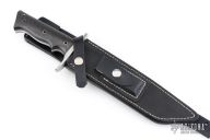This Model 2-7 Tanto by Walter Brend features a multi-ground two-tone blade with satin flats and satin polished grinds, 4.75" sharpened and serrated top edge, .278" blade stock and 1.501" blade depth, full tang construction. The handle has a satin finished titanium double guard, and carbon fiber scales, with lanyard hole. Comes with a black leather sheath with sharpening stone. Excellent condition.