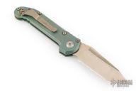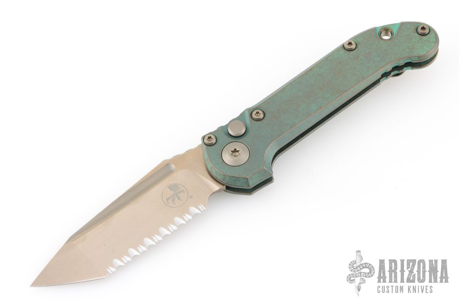 This LUDT side opening automatic by Microtech Knives has a bronzed stonewashed serrated blade with fuller. The handle has a bronze/green anodized titanium frame, notched backstrap, with a tip up stainless steel clip. Anodized accents. Comes with original box, papers, cloth, and metal COA dated 01/26. Excellent condition.