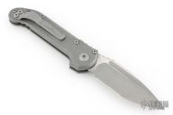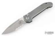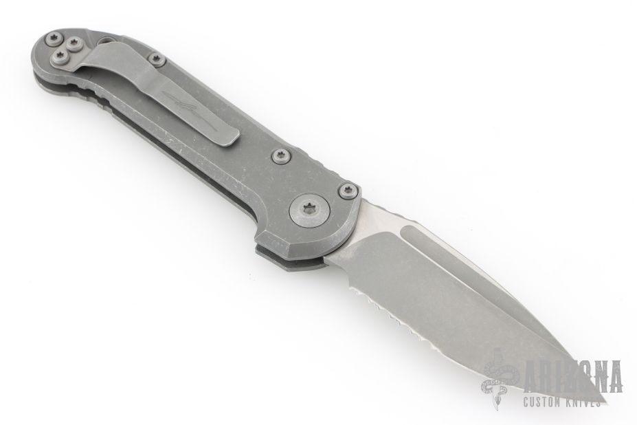 This LUDT side opening automatic by Microtech Knives has an apocalyptic stonewashed partial serrated blade with fuller. The handle has an apocalyptic titanium frame, notched backstrap, with a tip up stainless steel clip. Comes with original box, papers, cloth, and metal COA dated 11/25. Excellent condition.