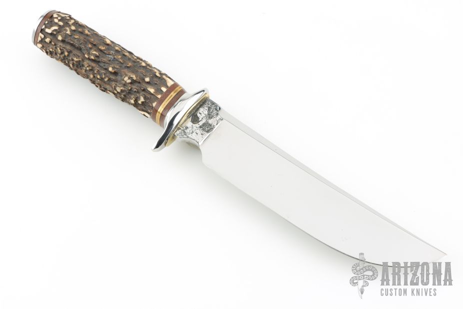 This large one off camp knife by Thierry Le Senecal features a mirror finished blade with false top edge and forge finished ricasso, .297" blade stock and 1.696" blade depth, hidden tang construction. The handle has a steel guard with a brass spacer, stag grip with brass and stacked leather spacers, steel butt. Excellent condition.