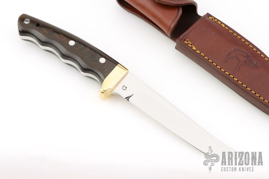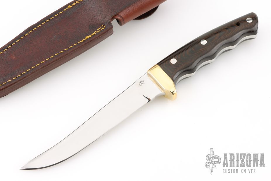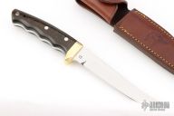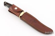This Prototype Forest Gal by Jean Tanazacq features a mirror polished blade with .185" blade stock and .932" blade depth, full tang construction. The handle has brass guard, black linen micarta scales with a lanyard hole at the butt. Comes with a brown leather sheath with hand tooled wild boar on the front. Excellent condition.