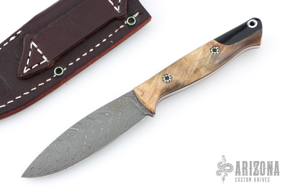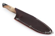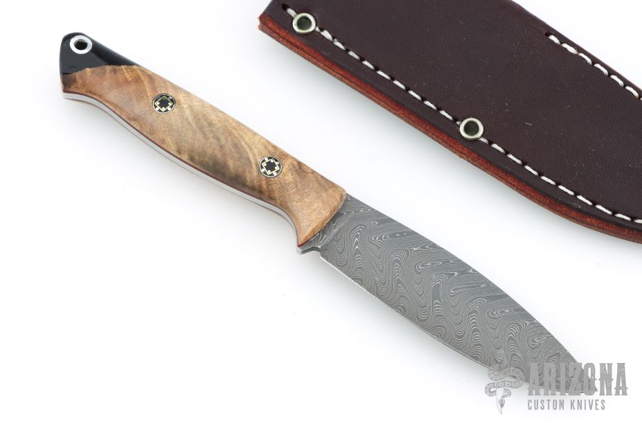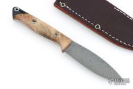This UP EDC by Bark River features a Damascus drop point blade with .122" blade stock and .963" blade depth, full tang construction with buckeye scales with red liners. Comes with a brown leather sheath and original box. Excellent condition.