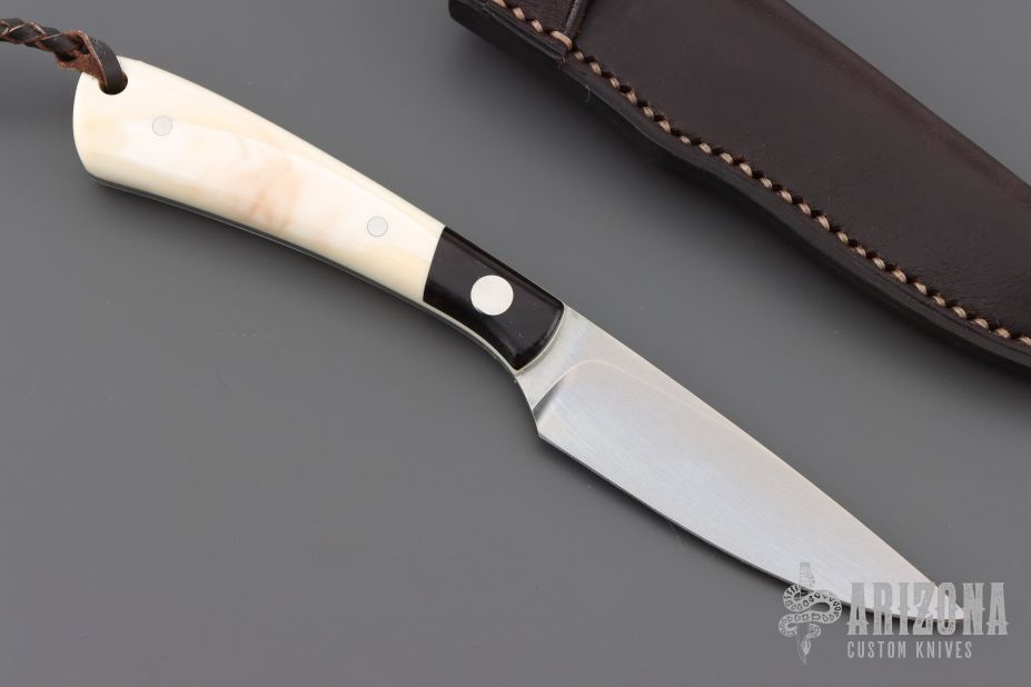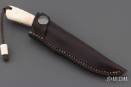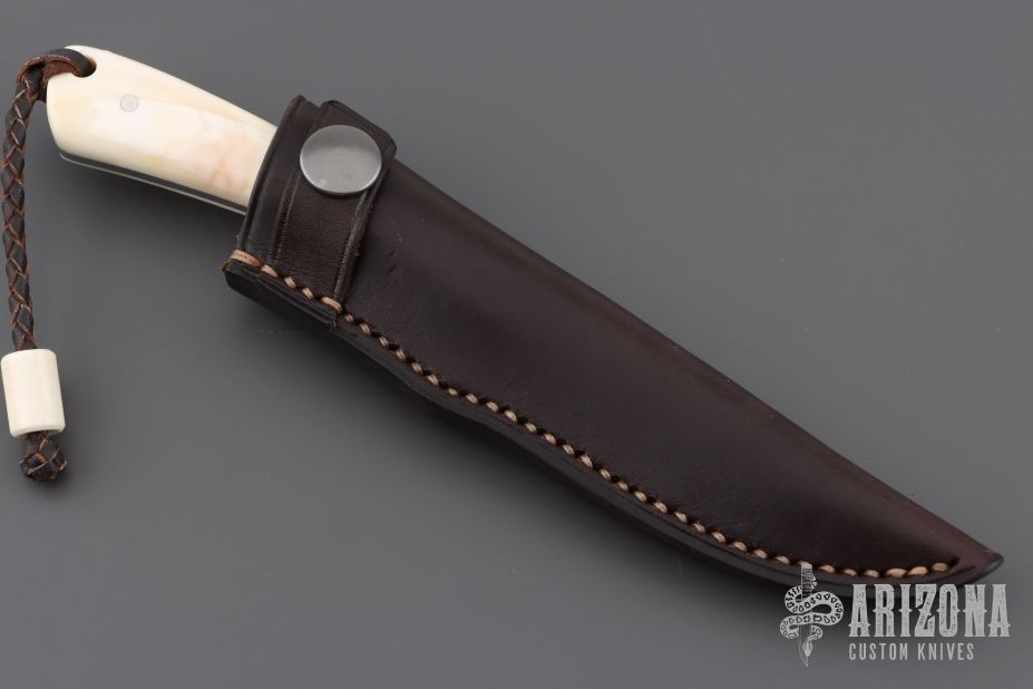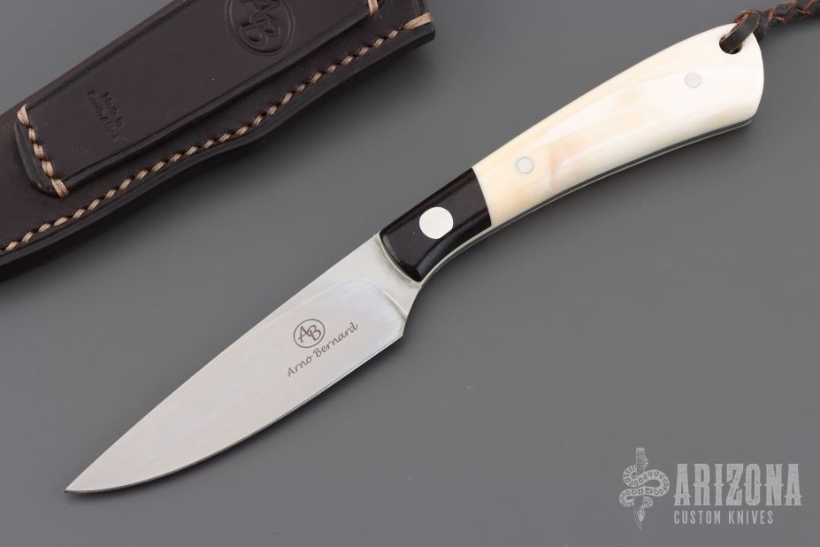 This "Fin and Fur" by Arno Bernard has warthog bone and wood handle scales. Stone wash hand rub satin finish N690 blade with .104" blade stock and .808" blade depth, full tang construction. Includes a brown leather sheath, COA, and original box. Excellent condition.