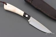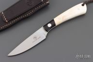 "I made my first knife in 1978 out of a saw blade, at that time I was a teacher at a technical school. I started making knives on a regular basis in 1991 and became a full time maker in 1996. I like to work with different ivory (legal), especially mammoth and warthog ivories. I work with steels like ATS34, 12C27, Damasteel and other Damascus. I live in South Africa and did my first show in the USA in 1996 and visit the States to do about 8 shows per year. I have been a member of the South African Knifemakers Guild since 1994. I make fixed blades as well as folders."