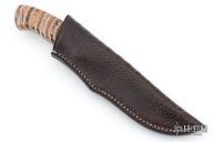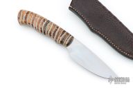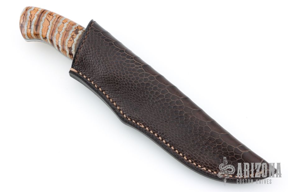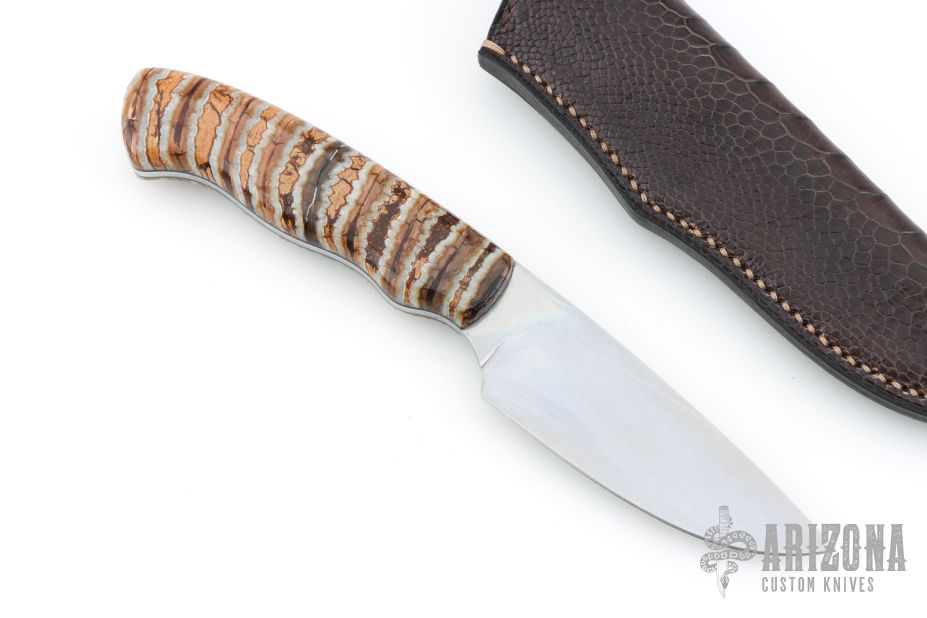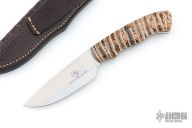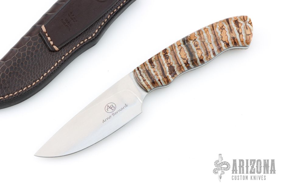 This "Zebra" from the Grazer series by Arno Bernard features a hand rub satin finished drop point blade, .119" blade stock and 1.238" blade depth, full tang construction. The handle has mammoth scales. Comes with a brown leather sheath, box, and COA. Excellent condition.