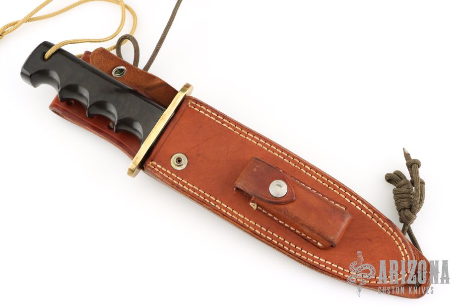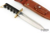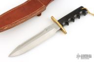 This Model 14 from Randall Made Knives features a satin finished spear point blade with sharpened top edge and sawteeth, .235" blade stock and 1.412" blade depth, full tang construction. The handle has a brass guard and black linen micarta finger groove handle.  Comes with Randall brown leather sheath and a zippered case. Has some light scratches and patina on the guard, otherwise excellent condition.