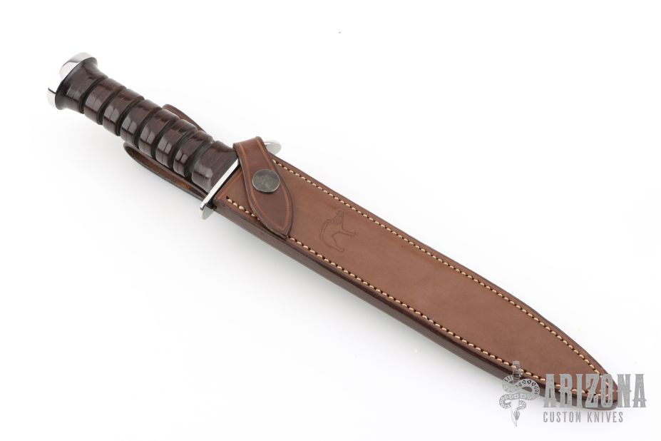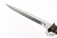 This WWII Combat Dagger Prototype by Jean Tanazacq features a mirror polished blade with sharpened top edge, .240" blade stock and 1.027" blade depth, hidden tang construction. The handle has polished stainless steel guard, stacked leather grip, stainless steel butt. Comes with a brown leather sheath with hand tooled wild boar on the front. Comes with a COA dated 7-8-85. Excellent condition. This knife wears both of his marks, wild boar stamp on one side and map of France on the other.