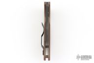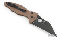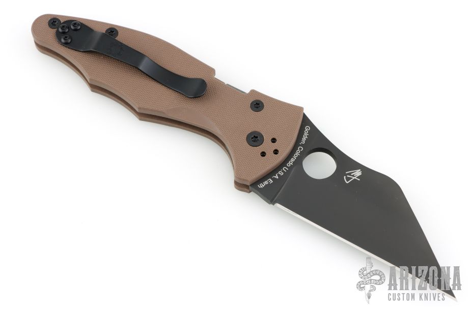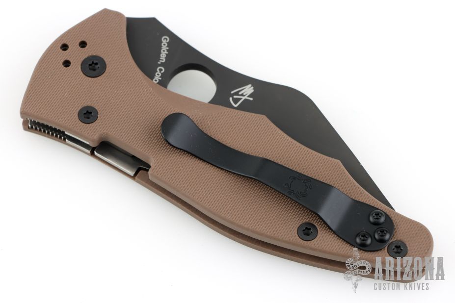 This Yojimbo 2 Folder by Spyderco Knives has a black DLC coated CPM S90V wharncliffe blade with thumbhole. Handle has brown sculpted G-10 scales with stainless steel liners (top-side lock), and a tip up black reversible stainless steel deep carry clip. Has some marks on the clip. Excellent condition. Comes with original box and papers.