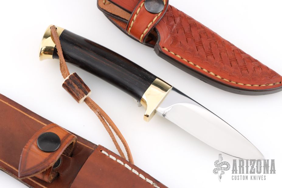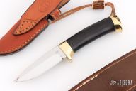 This Rocroy by Jean Tanazacq features a mirror finished blade with .204" blade stock and .871" blade depth, hidden tang construction. The handle has polished brass guard, ebony wood grip, polished brass butt. Comes with 2 brown leather sheaths. Comes with COA dated 2010. Excellent condition. This knife was named Rocroy in memory of the 350th anniversary of the Battle of Rocroy (1643) which was the first victory of Louis XIV against the Spanish. Comes with a brochure from the 350th Anniversary celebration of the Battle of Rocroy.