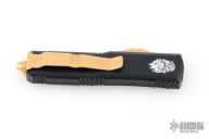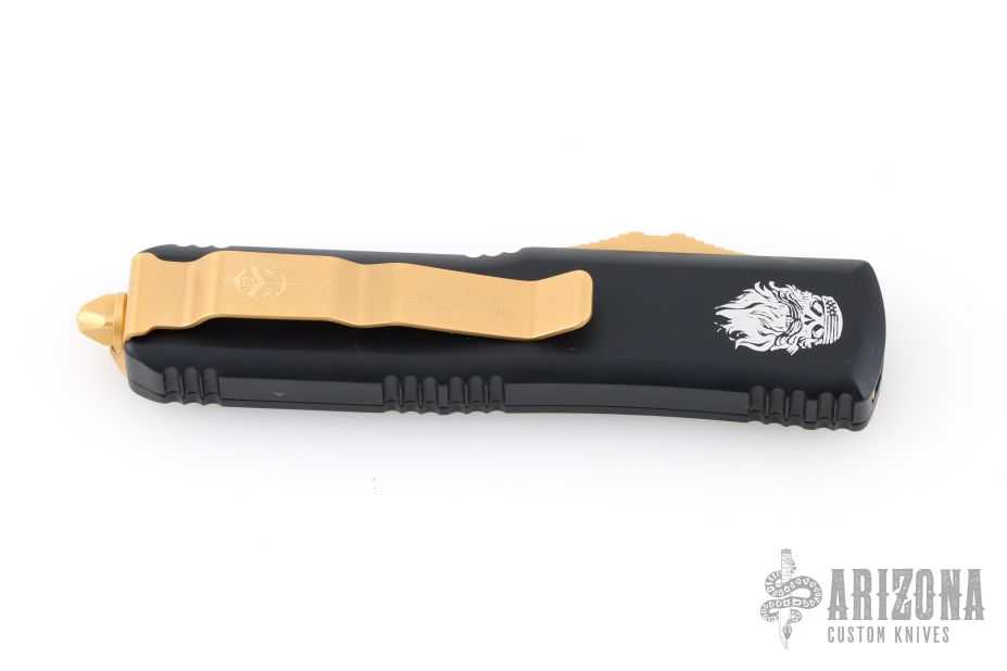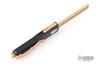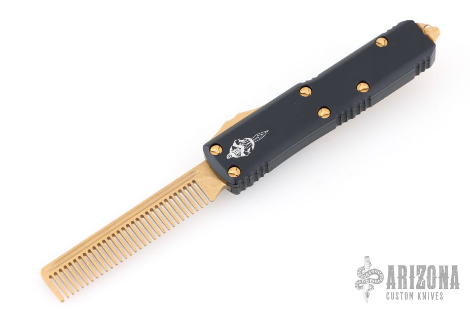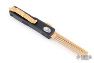 This UTX-85 OTF automatic Tactical Beard Comb by Marfione Custom Knives features a fine tooth hand ground stonewashed comb blade, and a black aluminum handle with tip down bead blasted stainless steel clip. Serial number 1222 and dated 04/2020. Comes with original box, metal COA, oil, and zipper case. Aftermarket gold anodize finish. Excellent condition.