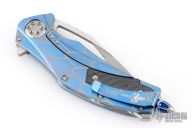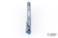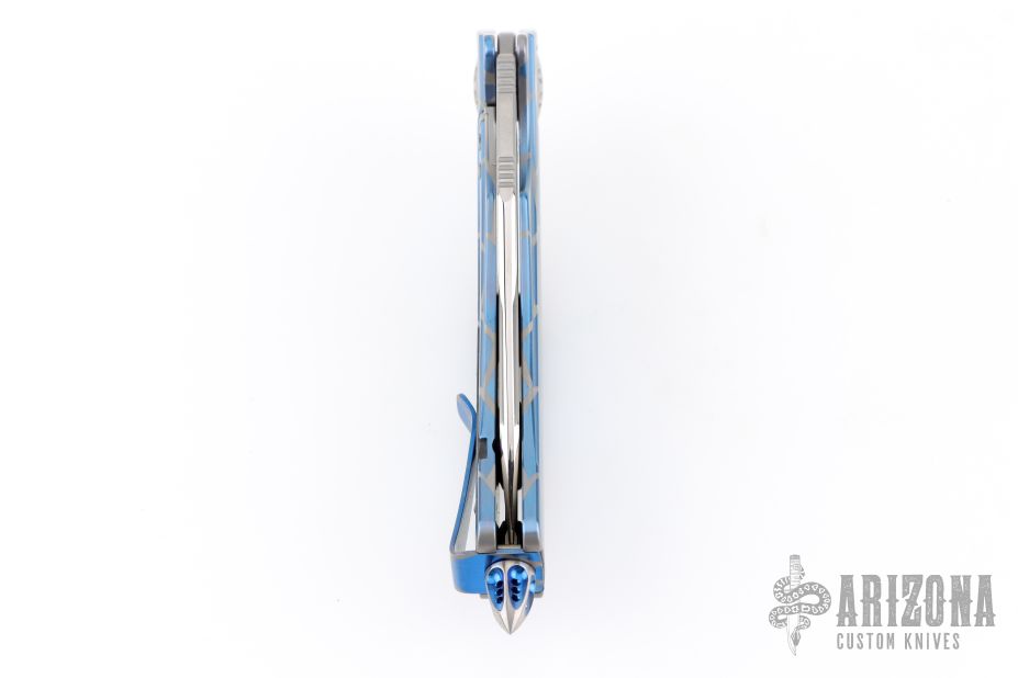 This Matrix-R by Marfione Custom Knives features a mirror finished blade with notched thumbrest and flipper. The handle has an anodized titanium frame, matching titanium tip up clip, titanium backspacer, hardware and a glass breaker at the butt. Comes with original zippered case, box and papers. Excellent condition. Dated 08/2017 and #003