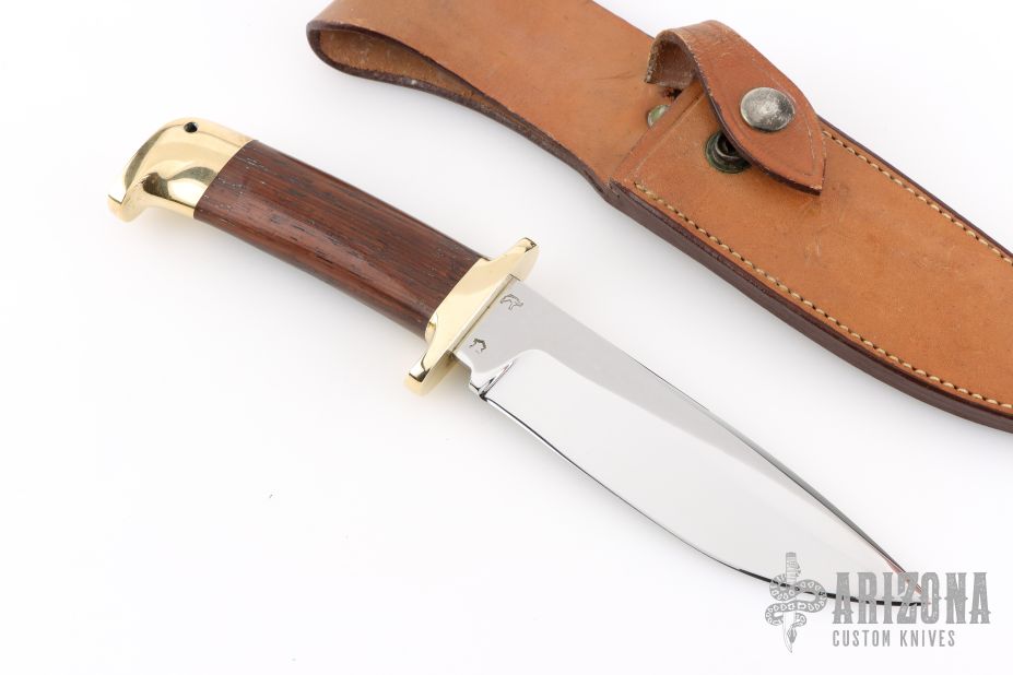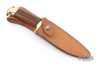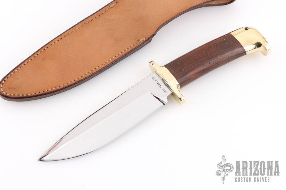 This Toncay 1 by Jean Tanazacq features a mirror finished blade with .250" blade stock and 1.343" blade depth, hidden tang construction. The handle has polished brass guard, wood grip, polished brass butt with lanyard hole. Comes with a brown leather sheath with hand tooled wild boar on the front. Comes with COA dated 5-20-1991. Excellent condition. This knife wears his name on the front "Jean Tanazacq", wild boar stamp, and small France map stamp.
