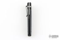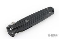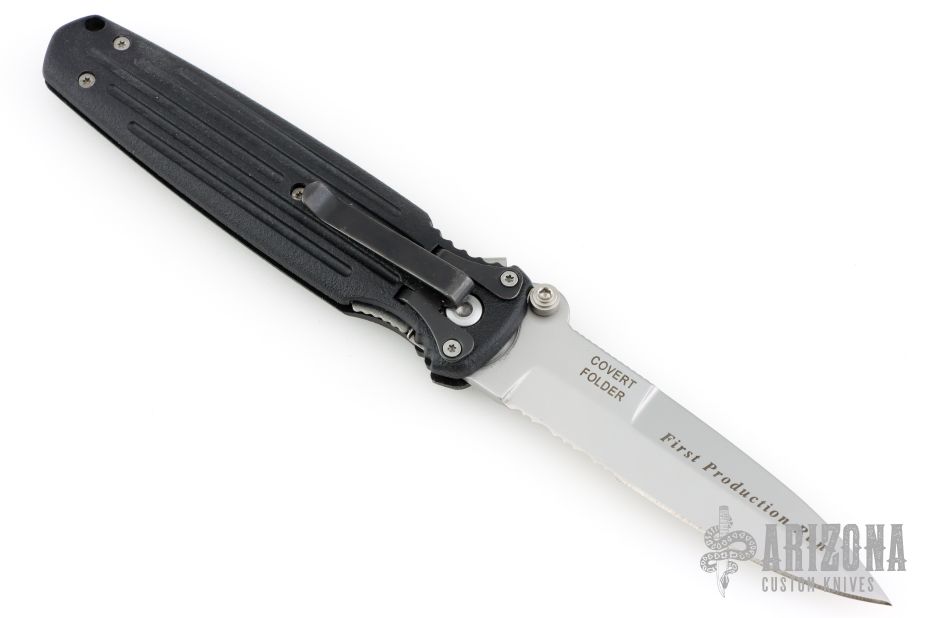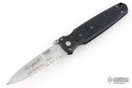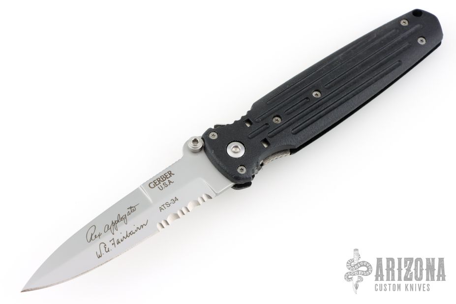 This combat folder by Gerber features a bead blasted spear-point partially serrated blade with dual thumb-studs and a notched thumb-rest. This knife also has a full flat grind which is less common than the typical dagger style grinds. Has a black composite handle with a stainless steel liner and safety that locks the blade in the open position.