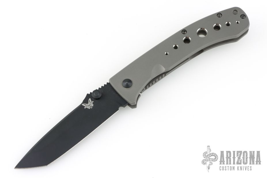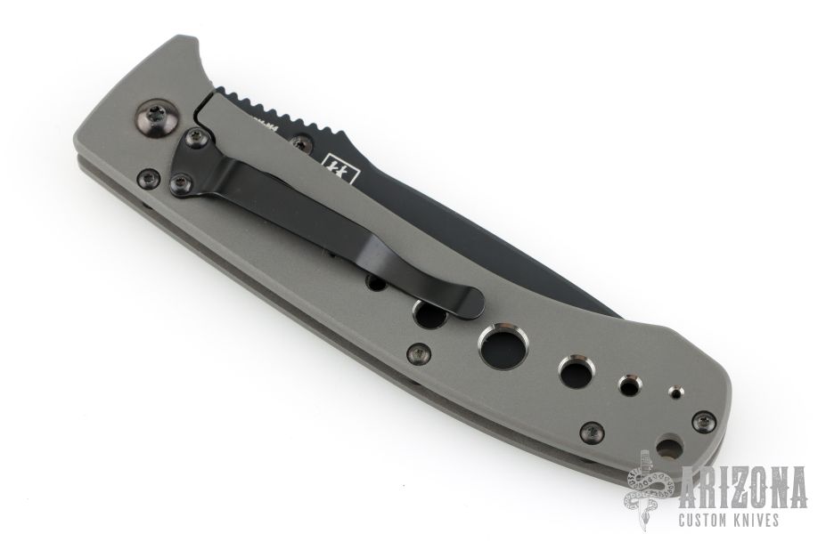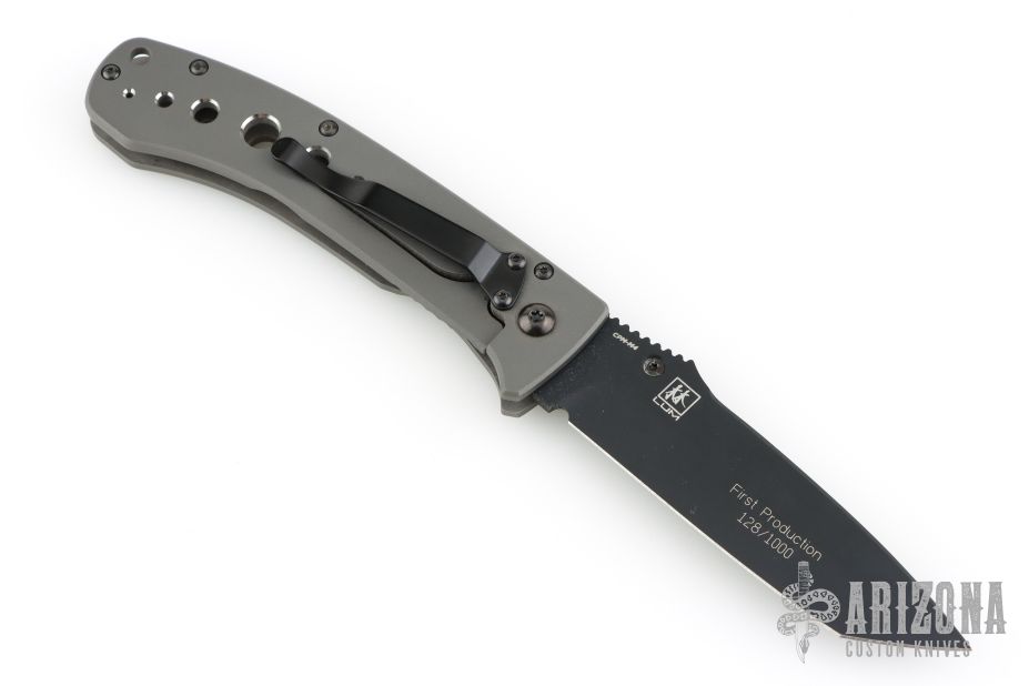 This 760BK LFTI framelock folder is a classic Lum design and features a black coated CPM-M4 stainless steel tanto blade with single thumbstud. Handle is bead blasted titanium with milled holes, black stainless steel tip down clip, and lanyard hole. Comes with original box and pouch. Has some blade play in both directions. Has a couple light scuffs. Excellent condition otherwise.