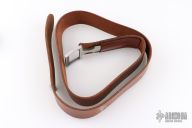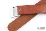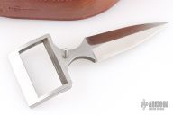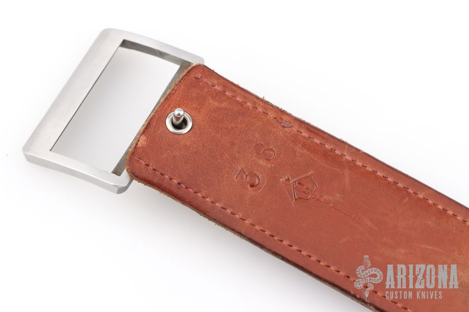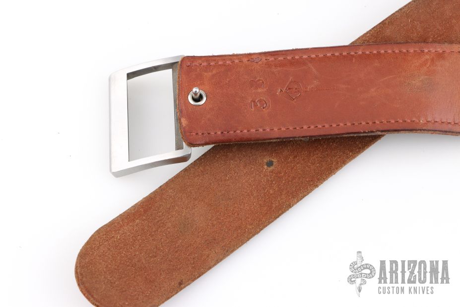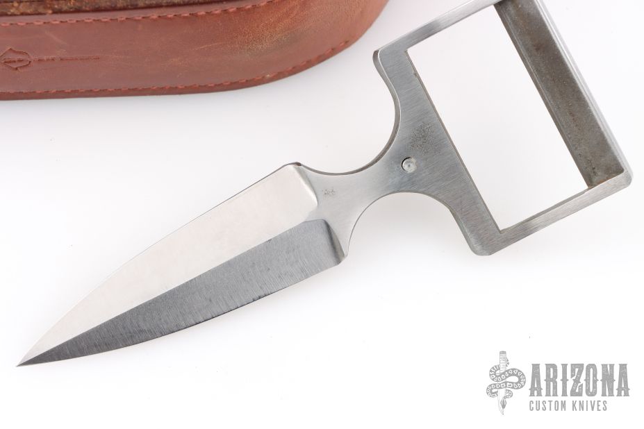 This is a belt buckle knife by Bowen USA. Has a double edged blade, .170" blade stock and .991" blade depth, integral construction. Comes with a brown leather 38" belt. Has a couple light scratches, otherwise excellent condition.