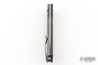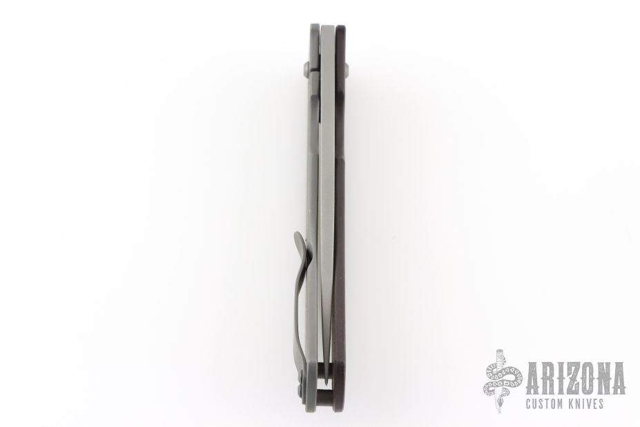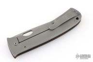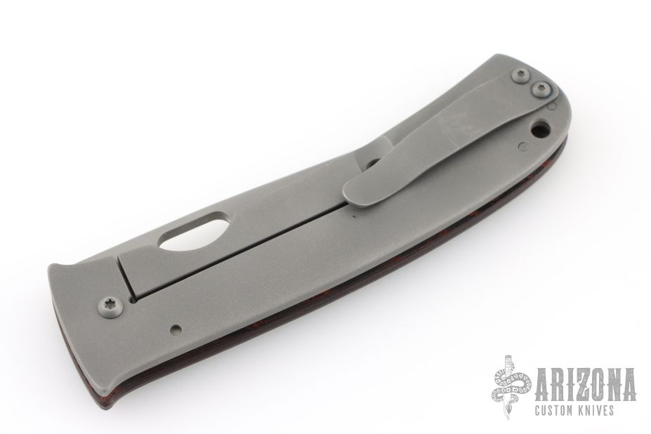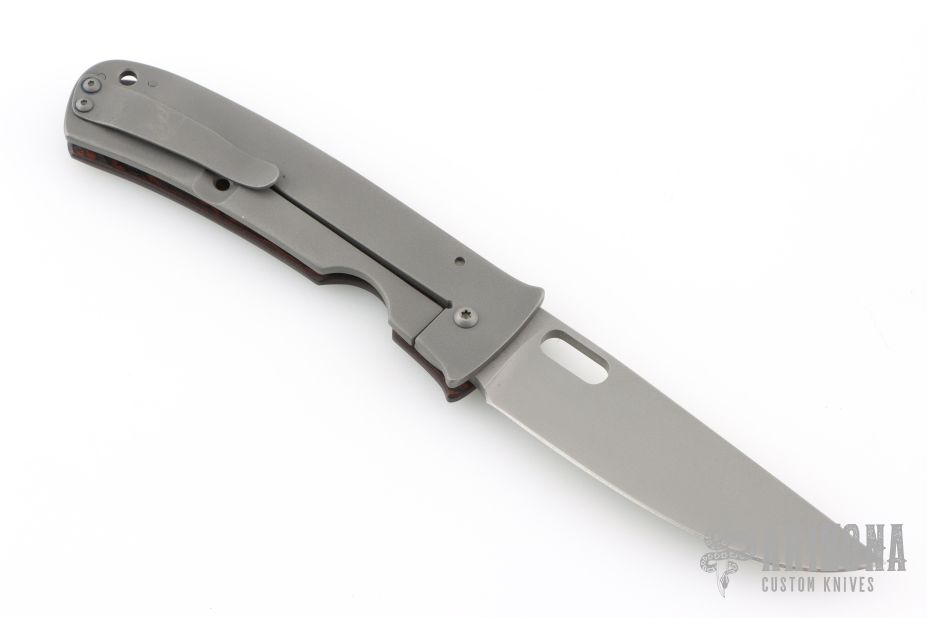 This framelock folder by Tom Mayo features a Stellite 6K blade with a fine bead blast finish and thumbhole opening. The handle has a red/black CarbonTi and bead blast titanium frame with titanium clip, tip up carry. Smooth action. Flat scales. Nice blade seating, detent, and lockup. Comes with a velcro case. Has a few light scuffs, otherwise excellent condition.