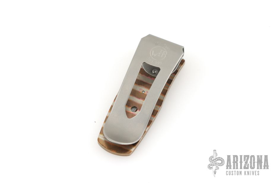 The Pharaoh 'Taos' by William Henry features a frame in heat-colored 'wave' mokume, inlaid with desert ironwood. The clip is machined and blast polished from tempered stainless steel, with a beautiful engraving bright cut against the matte-finished background. Comes with original box and COA dated July 22, 2021. Excellent condition.