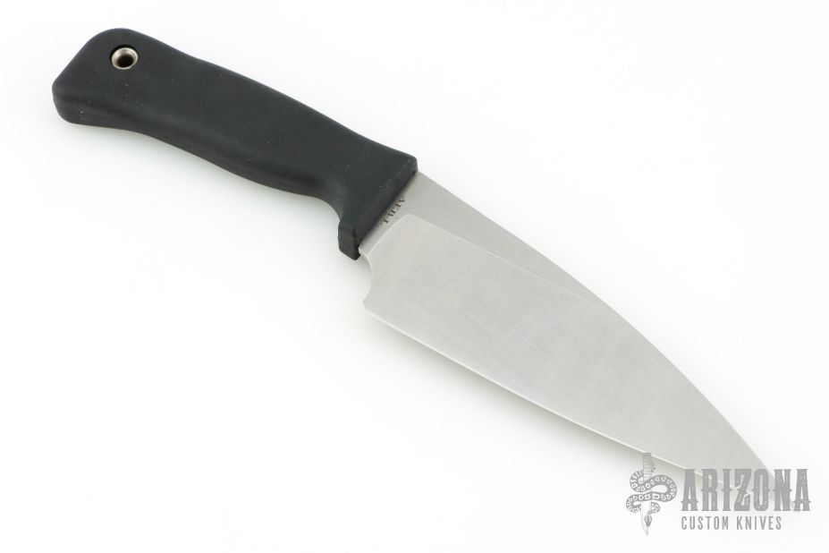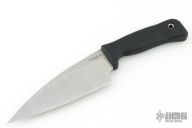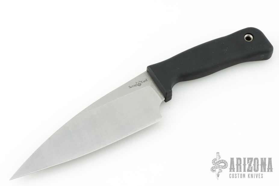 This Alpha Chef 6" by Scrapyard features a stonewash finished blade .110" blade stock and 1.997" blade depth, hidden tang construction. The handle is black Res C with a lanyard hole. Excellent condition.