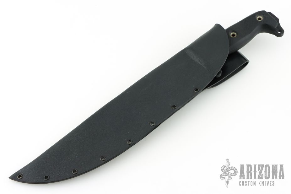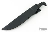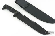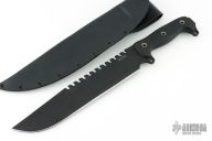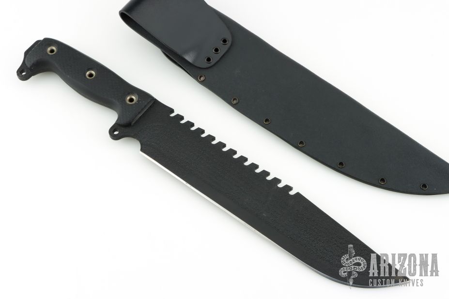 This Battle Saw by Busse Knives has a black coated blade with corrugated bevel technology, 11 saw teeth on the spine, large finger choil, .246" blade stock, 2.101" depth, full tang construction. The handle has black G-10 scales, exposed butt tang with lashing points. Comes with a custom Kydex sheath. Has been used, has scuffs and scratches, a couple small dings in the edge, otherwise good user condition.