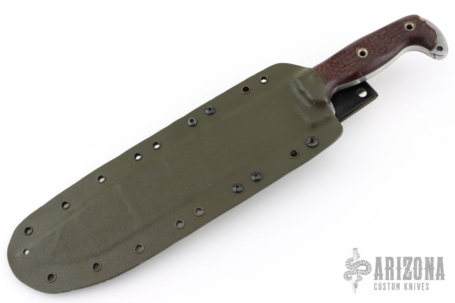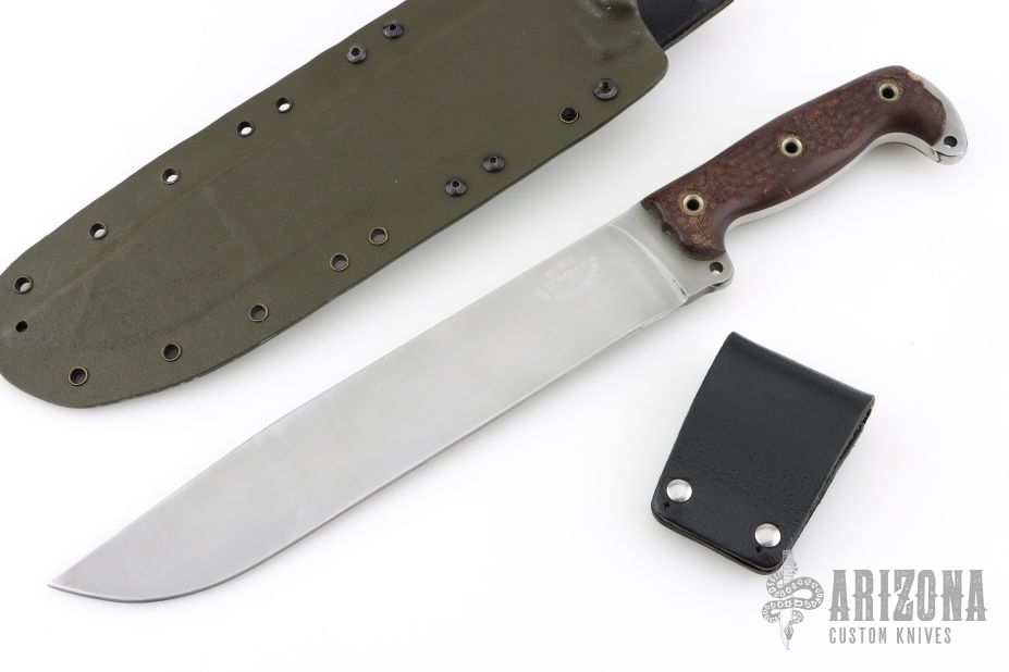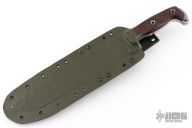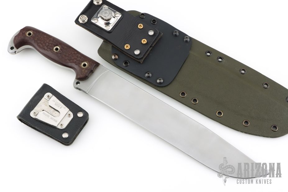 This 20th Anniversary Edition Straight Handle Battle Mistress from the Busse Combat Knife Company features a bead blast finished blade, .313" blade stock, 1.894" blade depth. Full tang construction with canvas micarta scales. Has some scratches and scuffs, has been sharpened, otherwise good condition. Comes with a custom Kydex sheath.
