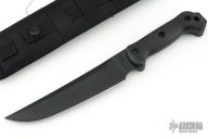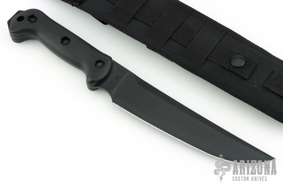 Becker Knife and Tool Magnum Camp knife with black coated plain edge 1095 Cro-Van carbon steel blade and Zytel handles. Trailing point style blade has full tang construction and lanyard hole.