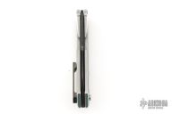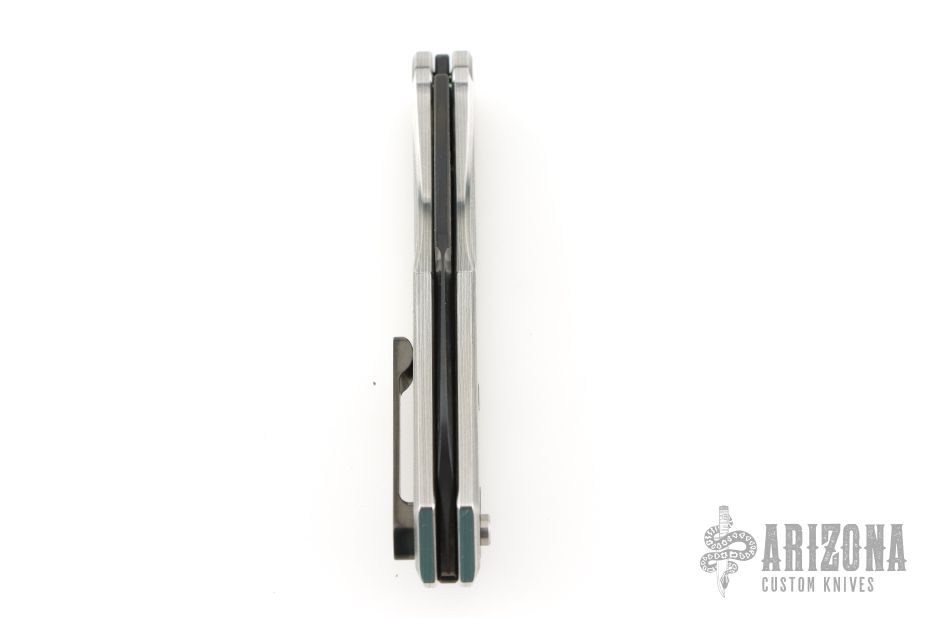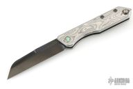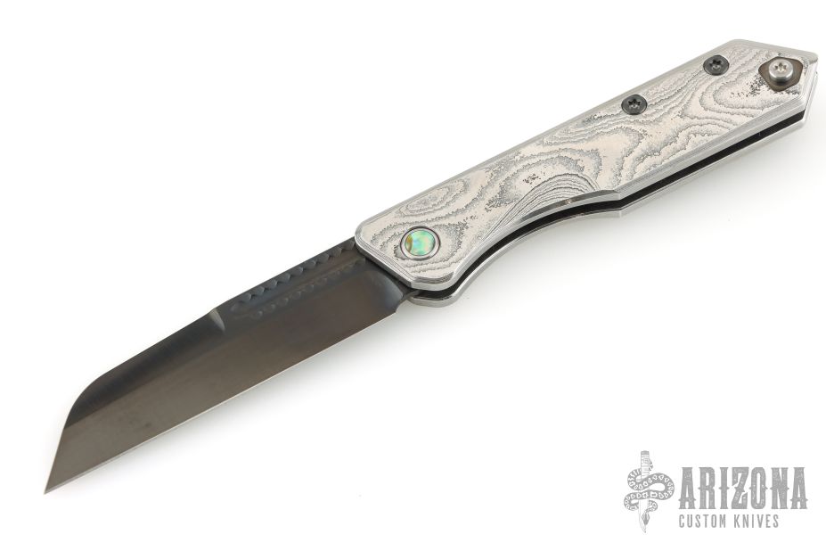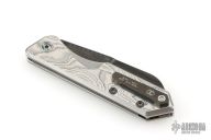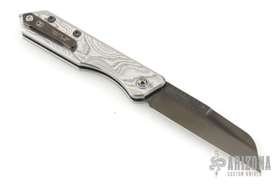 This Jinn slipjoint by Heretic Knives features a hand ground DLC wharncliffe blade with fuller nail nick and a false top edge. The handle has Vegas Forge Damascus covers, with abalone inlaid pivot, DLC hardware, matching tip up titanium clip, stainless steel spring. Comes with original box, zippered case and COA dated 5/23 and #006. Excellent condition.