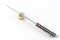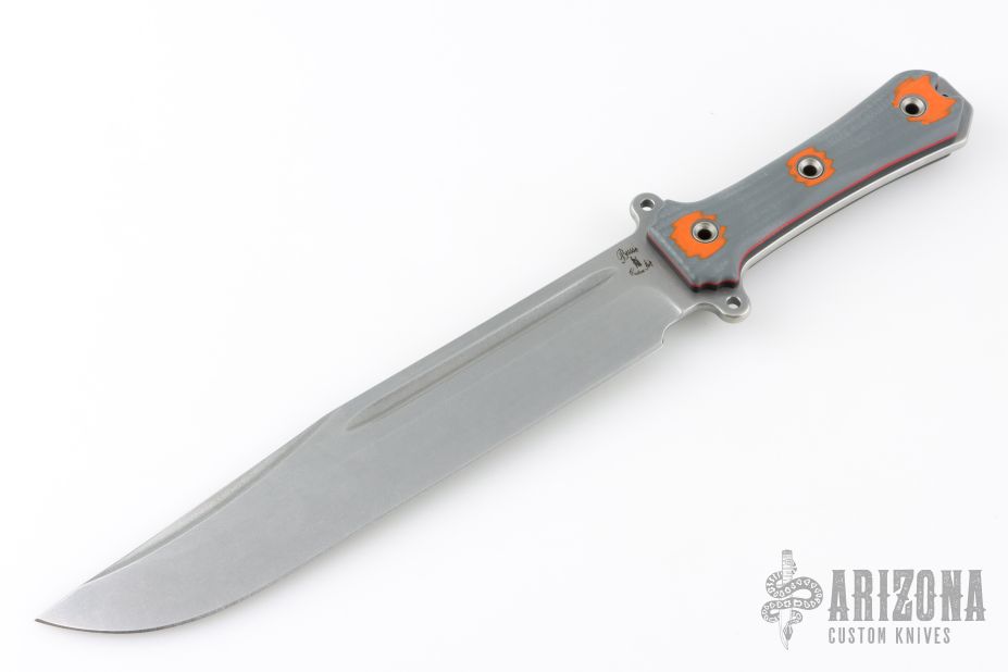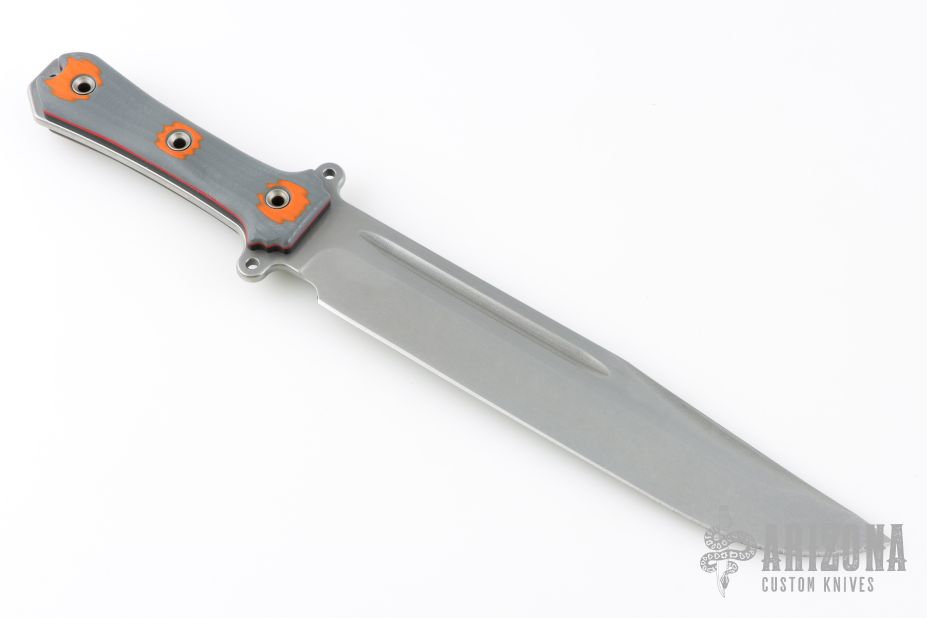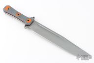 This ForeFather Bowie by Busse Custom Shop features a stonewashed blade with false top edge and fullers, .213" blade stock and 1.787" blade depth, full tang construction. The handle has nuclear orange/grey G-10 scales with black and red G-10 liners. New from maker.