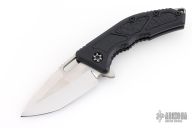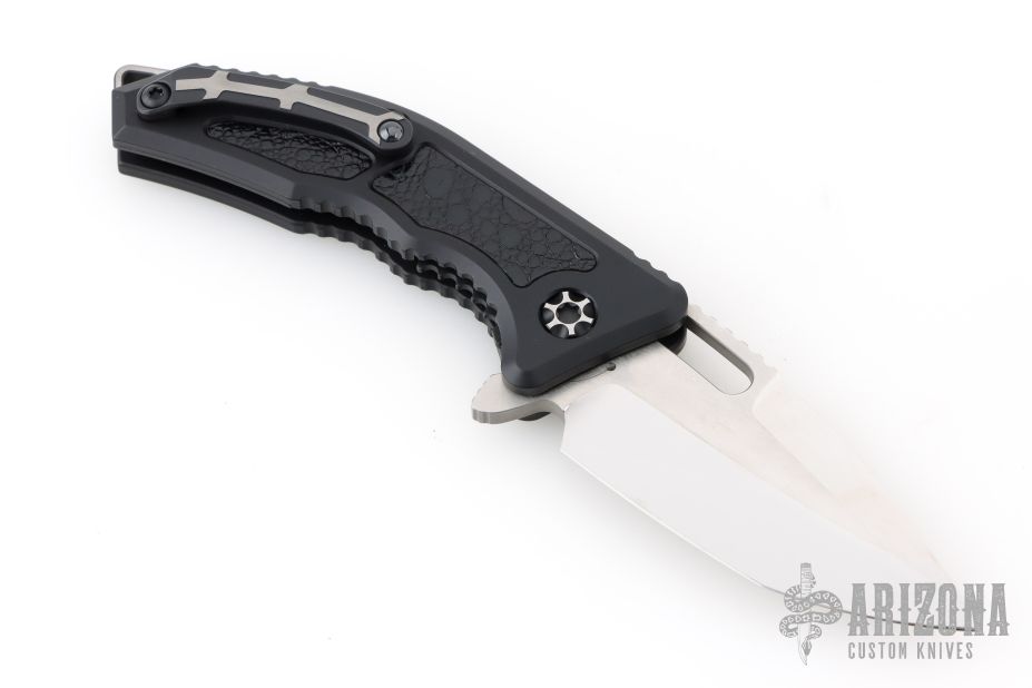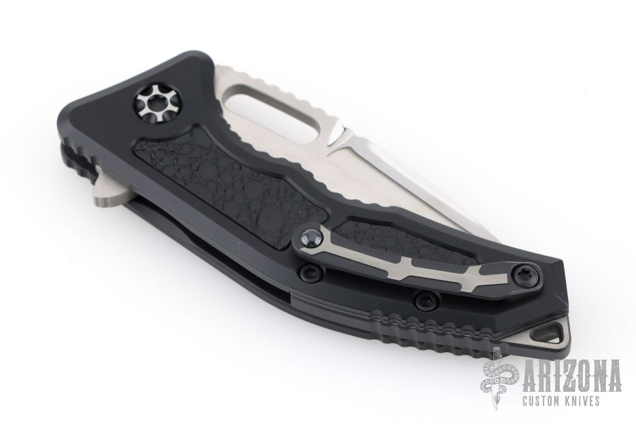 This Medusa by Heretic Knives features a hand ground high polish finish tanto blade with false top edge, notched thumbrest and flipper tab. The handle has a black aluminum frame, leather inlays, matching backspacer and a matching tip up stainless steel clip with ceramic ball. Comes with original box, zipper case and COA dated 02/24 #006. Excellent condition.