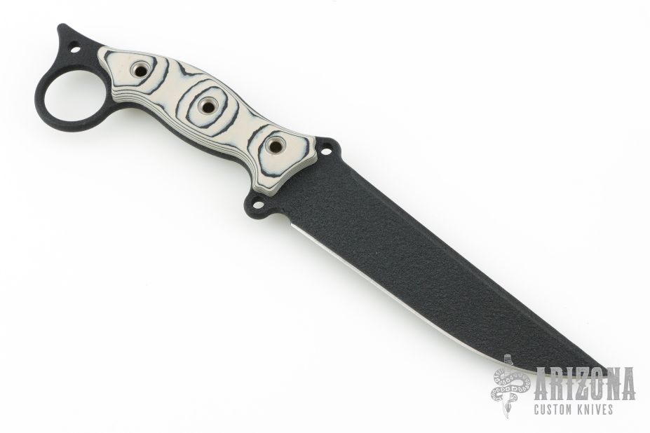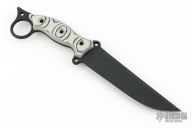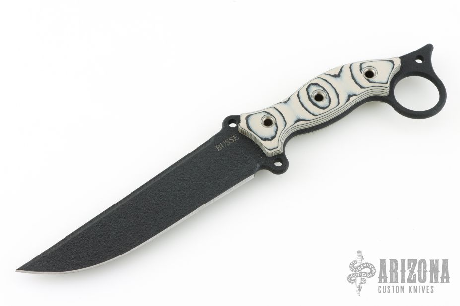 This Boaracuda Fighter by Busse features a black coated blade with false top edge, .231" blade stock and 1.471" blade depth, full tang construction. The handle has black/tan G-10 scales with extended tang and lanyard hole. New from maker!