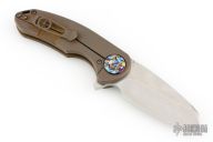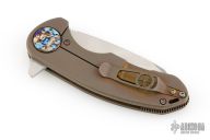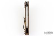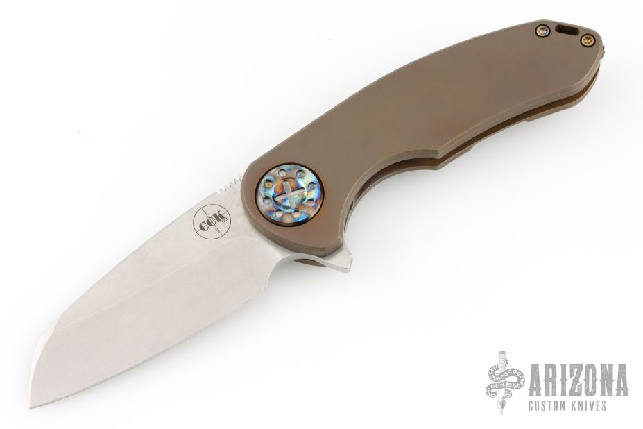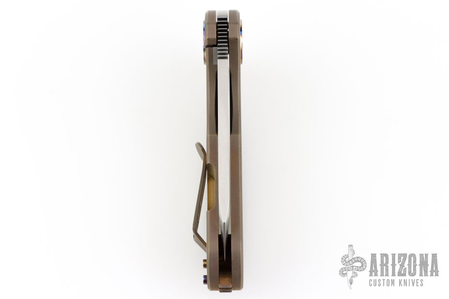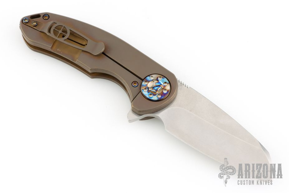 This F3 Medium by Curtiss Knives features a stonewashed blade with notched thumbrest and flipper. The handle has an anodized/tumbled titanium frame with a matching tip up titanium clip. Rides on bearings, nice detent and lockup. Flamed pivot and hardware. Comes with a zipper case and patch. Has a couple light scuffs, Excellent condition.