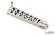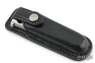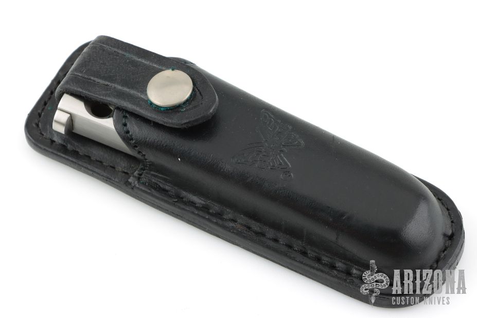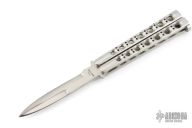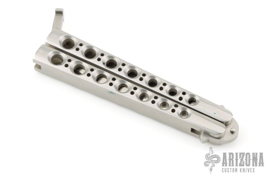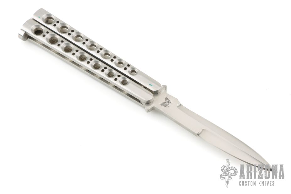 This early balisong from Pacific Cutlery features a Jody Samson ground satin finished blade with sharpened top edge. The handles are stainless steel with hole pattern. Comes in deluxe black leather Balisong belt sheath. Has a couple light scuffs and scratches, Great condition otherwise.