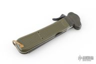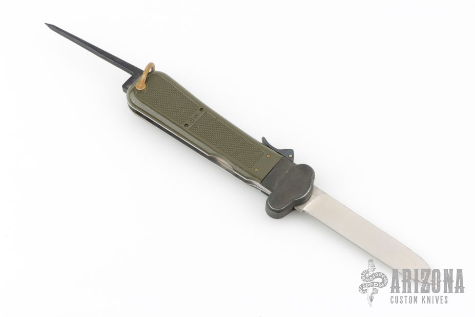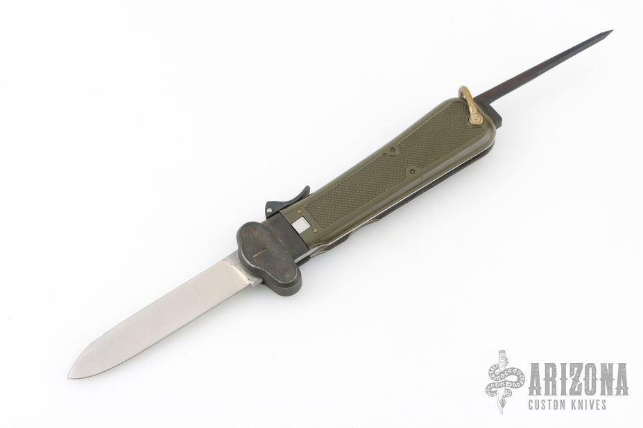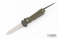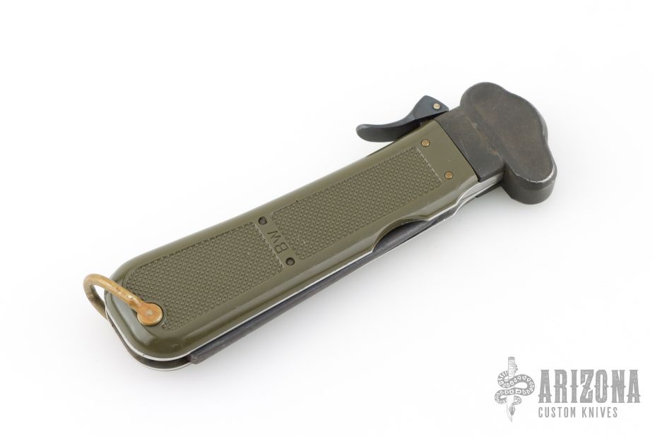 This knife features a satin finished blade. Blade deploys with gravity. The handle is black/green plastic. Has scuffs and scratches, great overall condition.