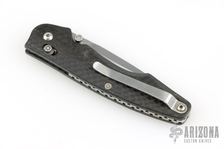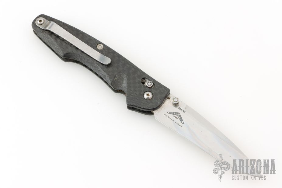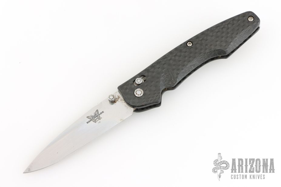 This Benchmade Osborne 771 features a satin finished drop point blade.  The handle has a carbon fiber frame with a stainless steel pocket clip. Has scuffs, oxidation, scratches, and is a little dirty. Fair condition; good user condition otherwise.