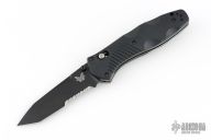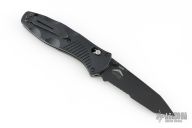 This 583 Barrage from Benchmade features a black partially serrated tanto blade with swedge and dual thumbstuds. The handle is comprised black FRN scales over stainless steel liners and FRN backspacer. This knife also features the AXIS lock mechanisim and sliding safety on spine. Comes with a BM drawstring pouch. Has some light scuffs, excellent condition otherwise.