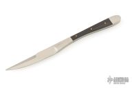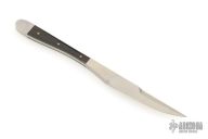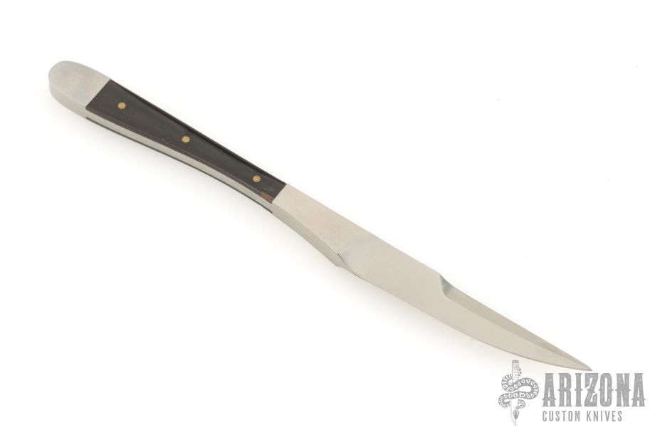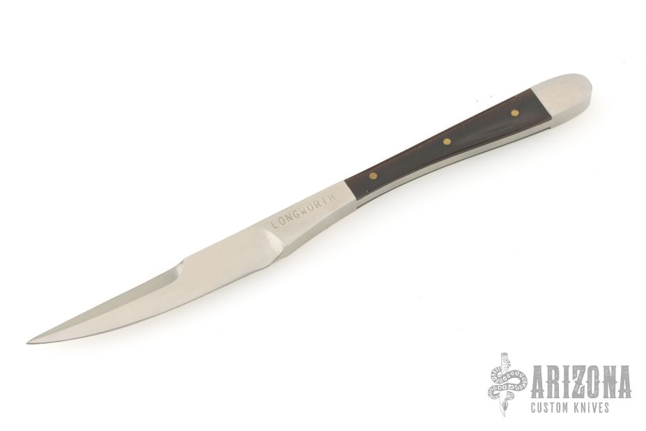 This Miniature knife/ Letter Opener by David Longworth is 5" long. It has a satin finished blade with false top edge, .182" blade stock and .346" blade depth, full tang construction. Has pinned black inlays. Has a couple light scuffs, excellent condition.