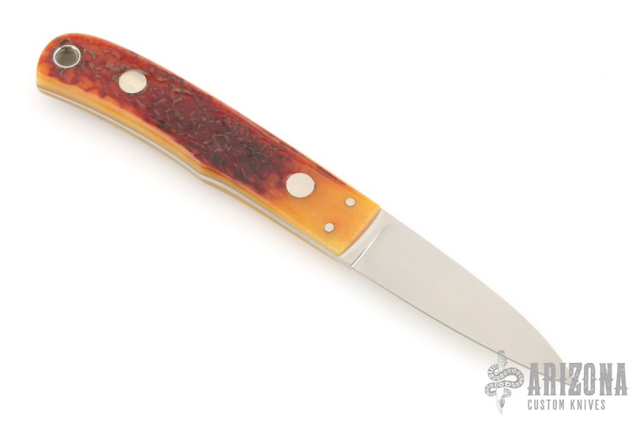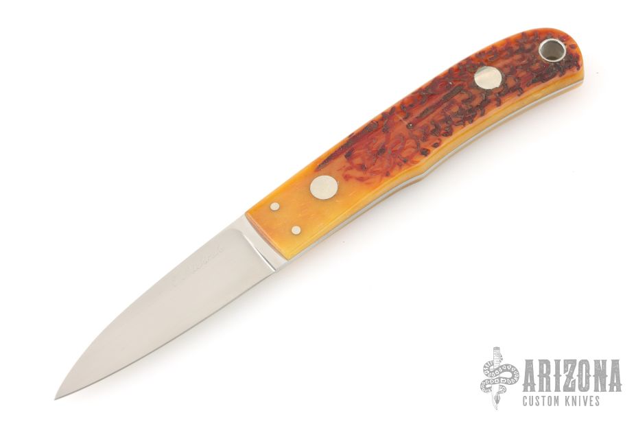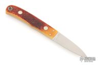 This knife by Toshiaki Michinaka features a hand rub satin finished blade with .075" blade stock and .611" blade depth, full tang construction. The handle has pinned amber jigged bone covers with lanyard hole in pommel. Has some light scratches, great overall condition.