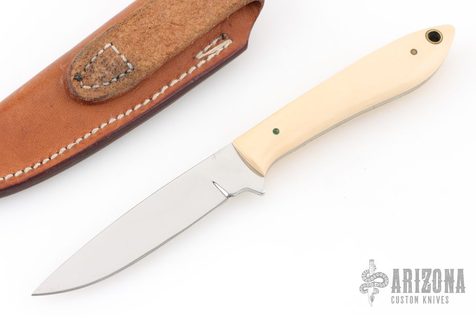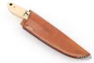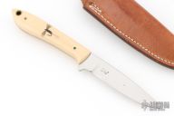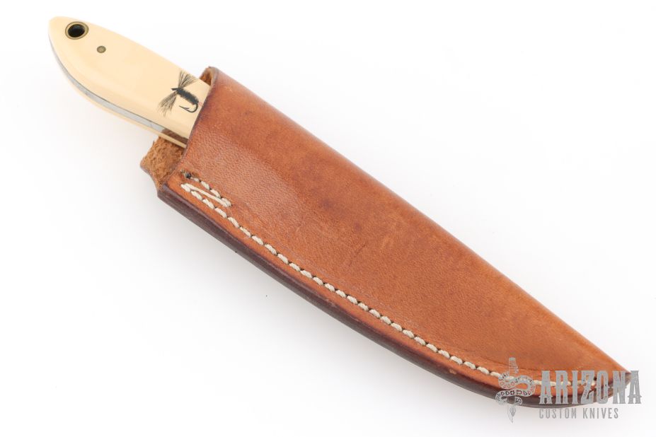 This knife by George Worth features a mirror finished blade with .124" blade stock and .678" blade depth, hidden tang construction. The handle has scrimshaw finished ivory paper micarta covers, with brass pins and lanyard hole in pommel. Comes with leather belt sheath. Has some light scuffs, and scratches, excellent condition otherwise.