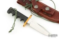 This is a miniature version of Randall's Model 14 Attack. The Model 14 was designed to meet the demand for an almost indestructible all-purpose knife, though it is especially suited for combat and survival purposes. #1921. Satin finished blade with sharpened top edge, .180" blade stock and .831" blade depth, full tang construction. The handle has a brass guard and black linen micarta grip, lanyard hole at the butt. Comes with original brown leather sheath and a zippered case. Excellent Condition.